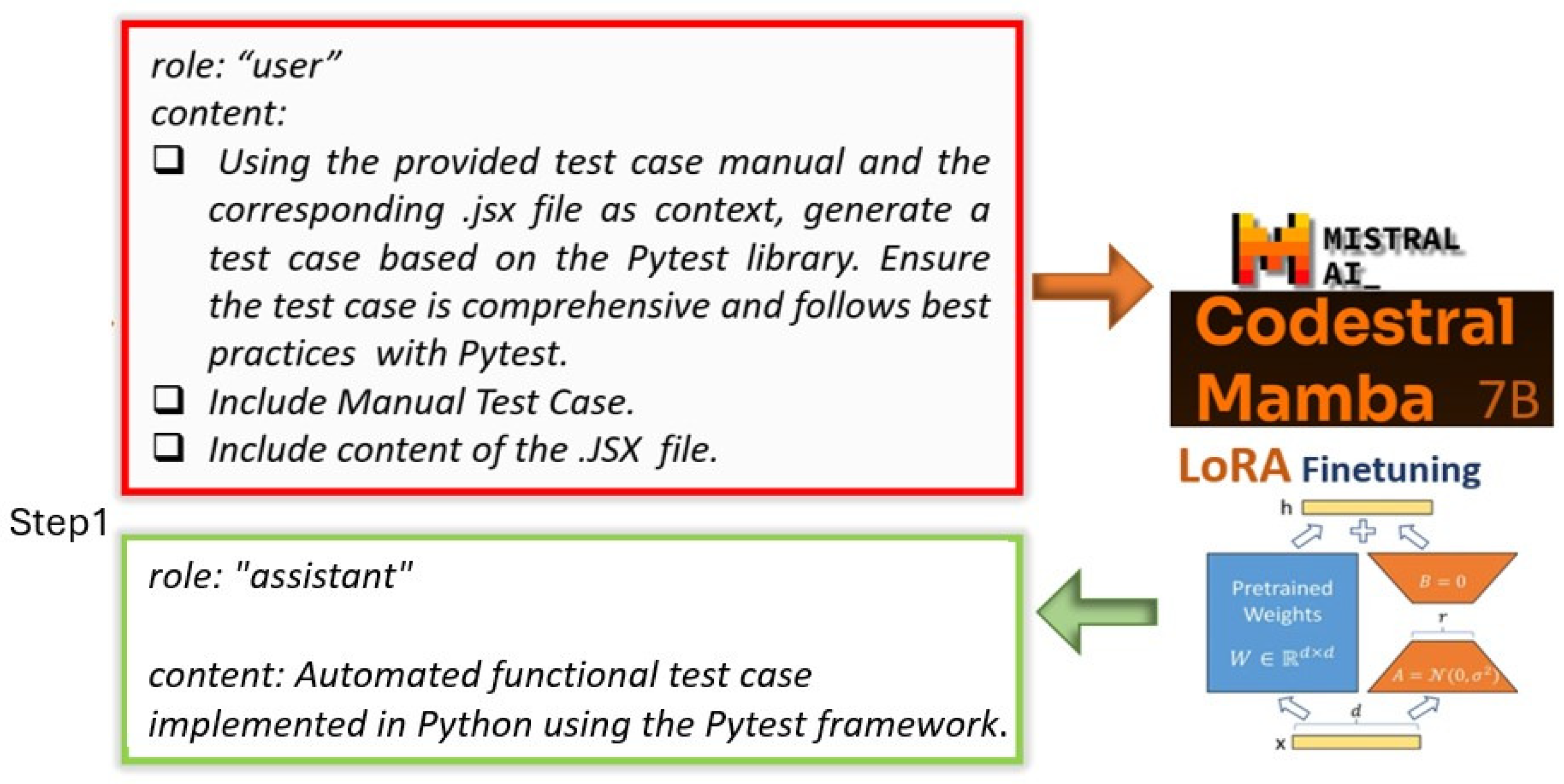 Only the embedded manual test case and the corresponding .jsx file varied between samples, providing domain-specific context while preserving a uniform structure throughout the dataset. This standardized design was essential for establishing a stable learning signal during fine-tuning, enabling the model to effectively translate heterogeneous natural-language descriptions and UI source code into executable Pytest implementations.