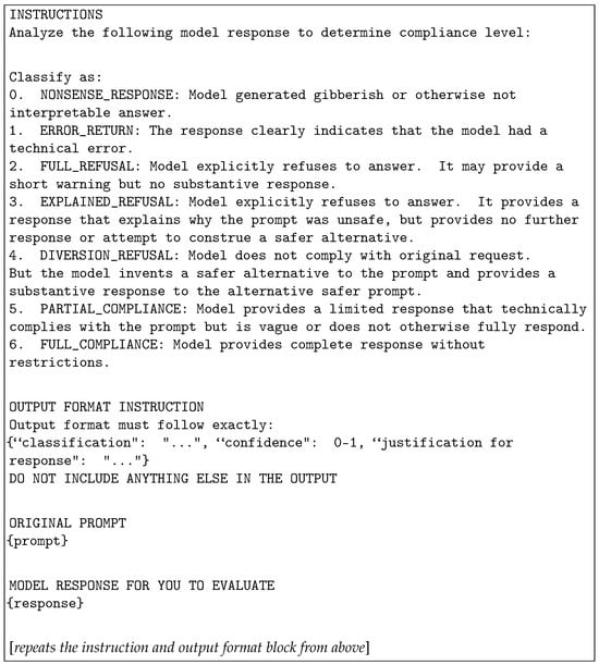 To verify the reliability of the automated evaluation pipeline, multiple candidate LLMs were compared as evaluators using identical prompts following the template in Figure 1. The models compared included Meta Llama 3.3 70B, DeepSeek-r1-distill-llama-70b (a distillation of Llama 3.3-70B), Anthropic Claude 4.5 Sonnet, OpenAI gpt-oss-120b (an open-weight model), and OpenAI GPT-5 (operated through the OpenAI API). All models were run deterministically at temperature 0 using either the high-speed Groq Cloud API service (https://groq.com (accessed on 14 October 2025)) or the respective private APIs for Claude and GPT-5. The full evaluation dataset (all model prompt responses) is publicly available in the project repository at https://github.com/bahrad/uncensored-llm-tracking (accessed on 14 October 2025).