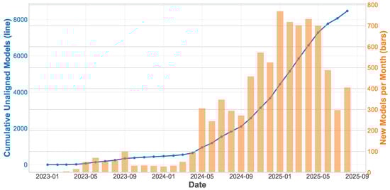 Figure 2 demonstrates the accelerating monthly growth of modified (i.e., uncensored) models until 31 August 2025. The trend indicates a clear inflection point in the ecosystem’s development. The monthly release rate of new uncensored models shows sustained acceleration throughout the observation period, with the most substantial growth occurring in the latter half of 2024. This accelerating trend is consistent with the transition of safety removal techniques from initial exploration based on discrete research studies and exploratory work to increasingly systematic practices adopted by broader segments of the open-source AI community.