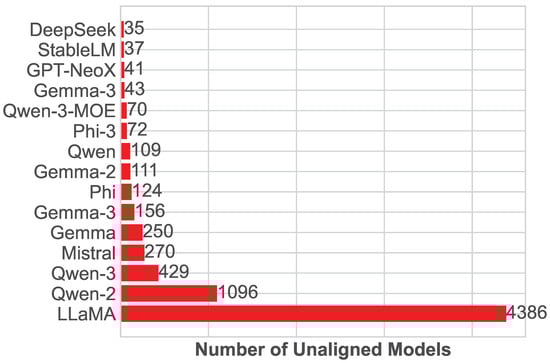 Top model families most frequently modified for safety removal. This is based on the ability to identify the modified model family, which can be concealed or hard to determine for some uncensored models. Bars show the total number of uncensored variants identified for each family (e.g., Qwen, Llama, and Mistral), with labels including the number of each family’s models that have been modified with the objective of reversing their alignment tuning. This view highlights which families have been the most targeted for dealignment.
