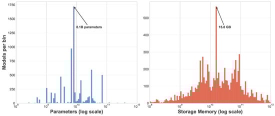 Similarly, the storage (memory usage) distribution shows a dominant peak at 15.8 GB. Although an 8B parameter model at full precision (FP32) would require approximately 32 GB of storage, weights can be stored in a lossless 16 bit format, such as bf16 precision [70]. Accordingly, the model memory usage is actually consistent with the modal parameter size of 8.1B parameters, given that 16 bit weights are typical. However, unlike the parameter size distribution plot, the storage plot shows considerably more dispersion than the parameter distribution. This dispersion appears to reflect the impact of quantization and packaging strategies on final model size, including, as shown below, the large number of quantized models that are available so that even very large models can be run locally as well as more efficiently on lower-cost cloud platforms.