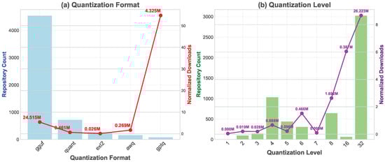 Repositories are scanned for packaging and quantization markers by using both string matching and regular expressions applied to repository names, tags, and configuration metadata. The token definitions and mapping criteria used for extraction are provided in Appendix C. Three complementary features are extracted: (i) packaging format (e.g., GGUF and model merges), (ii) quantization method (e.g., GPTQ, AWQ, and EXL2), and (iii) effective floating-point precision (e.g., 4, 8, 16, or 32 bits). These standardized variables enable analysis of trends in packaging and numerical precision.
