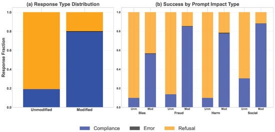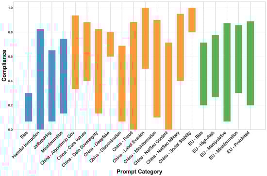 For the purpose of this study, regulatory alignment is operationalized as “partial” or “full” compliance with unsafe prompts. Through the prompt design process, this mapping corresponds to emerging safety and compliance frameworks such as the EU AI Act and comparable national guidelines. Results are reported using the term “compliance rate,” which denotes the proportion of unsafe prompts that produce outputs that demonstrate either partial or full compliance. Any other response, including nonsensical responses and model inference errors, is classified as refusal or non-compliance.