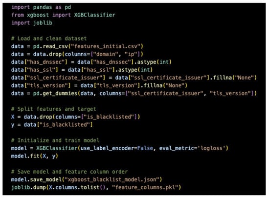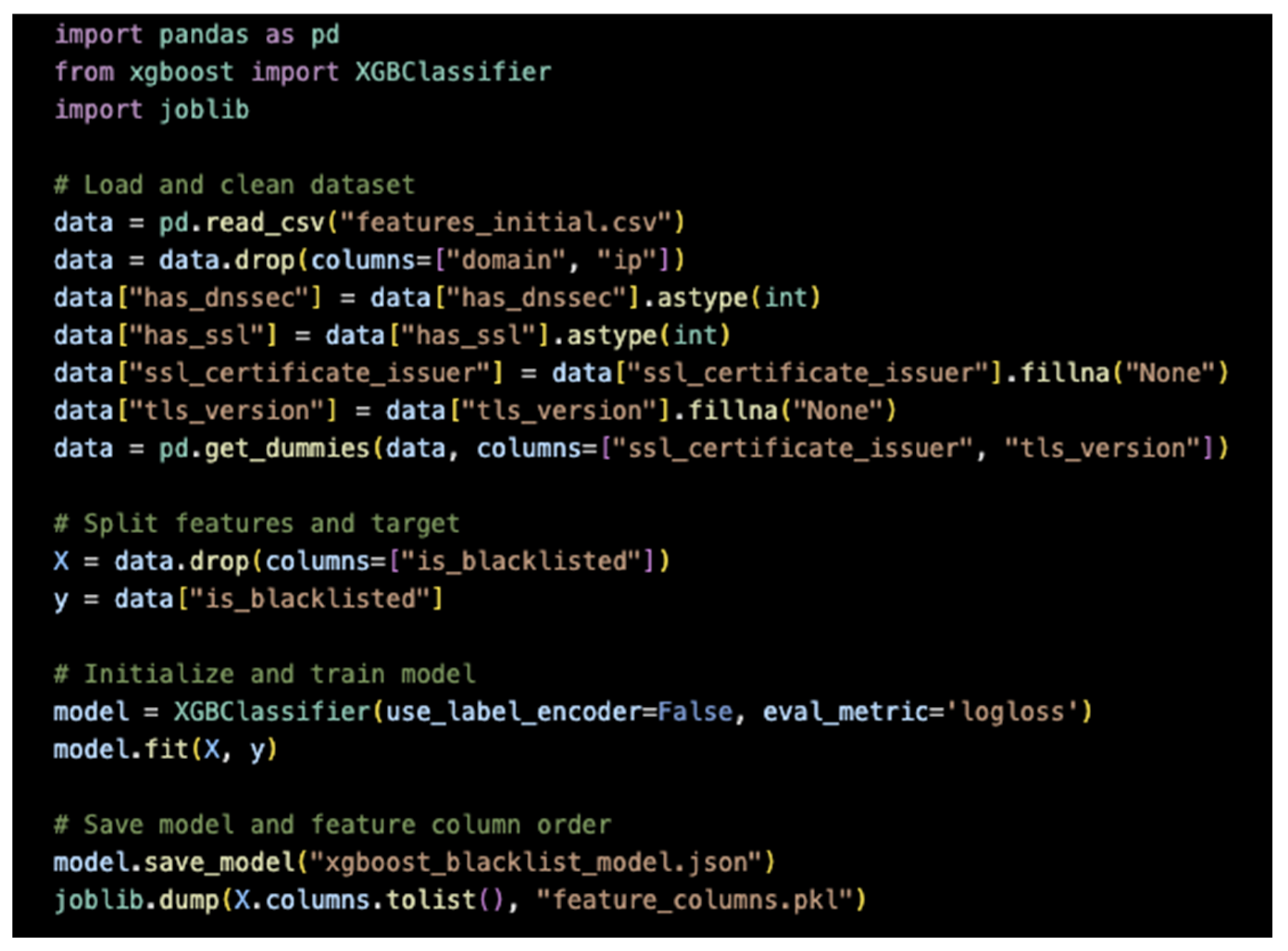 The most important component of the backend infrastructure is the integration of a trained XGBoost model. This model, previously trained on historical data labelled with a binary variable indicating whether a domain is blacklisted, is serialized and saved to disc. At application startup, the model is loaded once using the load_model method in XGBoost, and the corresponding list of feature columns is restored using joblib. This ensures consistency between the training and inference stages.