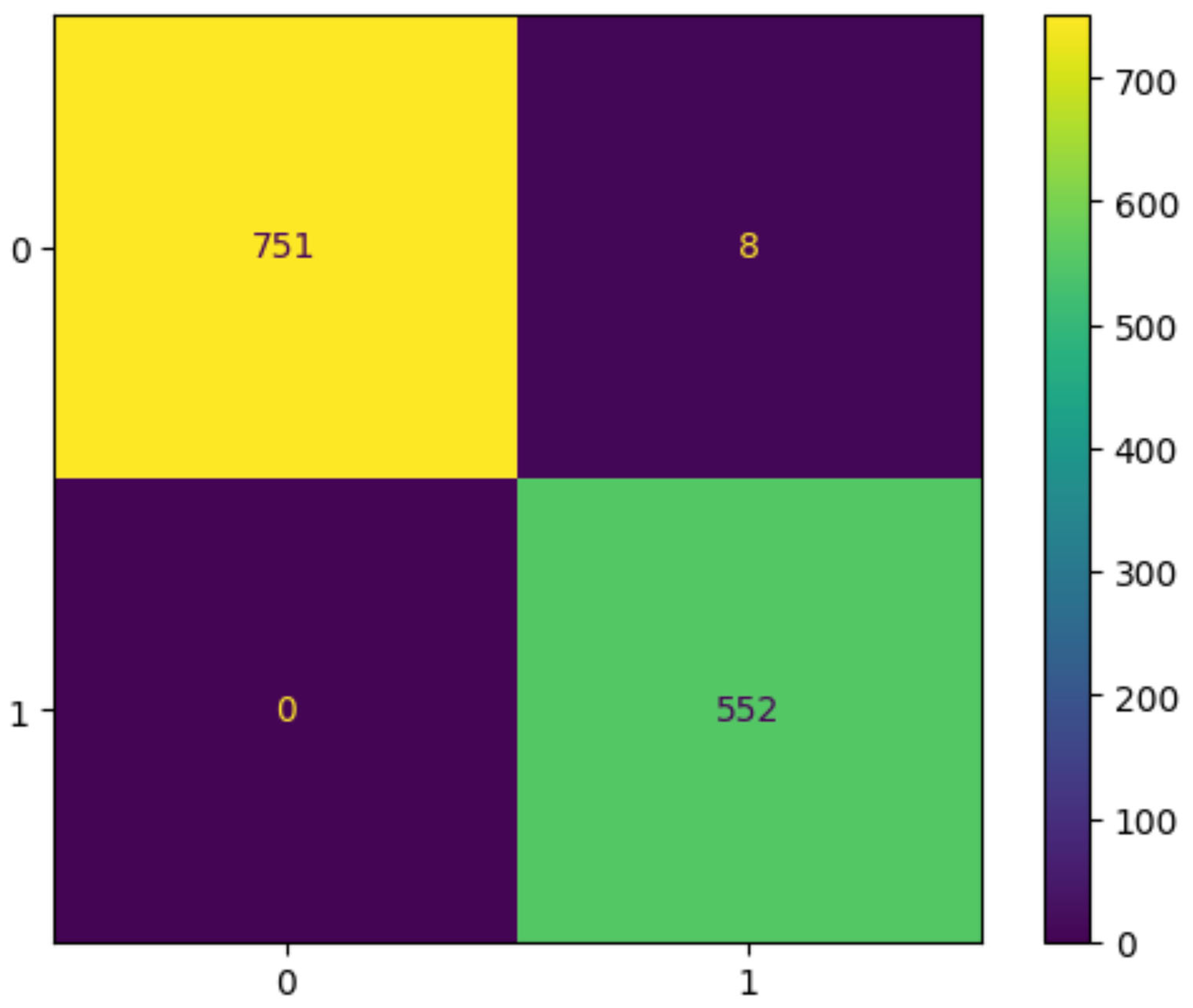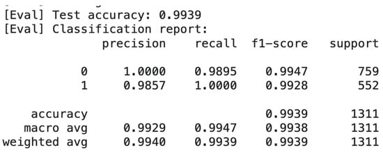 For benign domains (class 0, n = 759), the model achieved precision = 1.0000, recall = 0.9895, and F1 = 0.9947. For malicious domains (class 1, n = 552), the model reached precision = 0.9857, recall = 1.0000, and F1 = 0.9928. Macro-averaged metrics were precision = 0.9929, recall = 0.9947, and F1 = 0.9938. Weighted averages were consistent (0.994). These results confirm balanced performance across both classes, with very few false negatives and a small number of false positives.