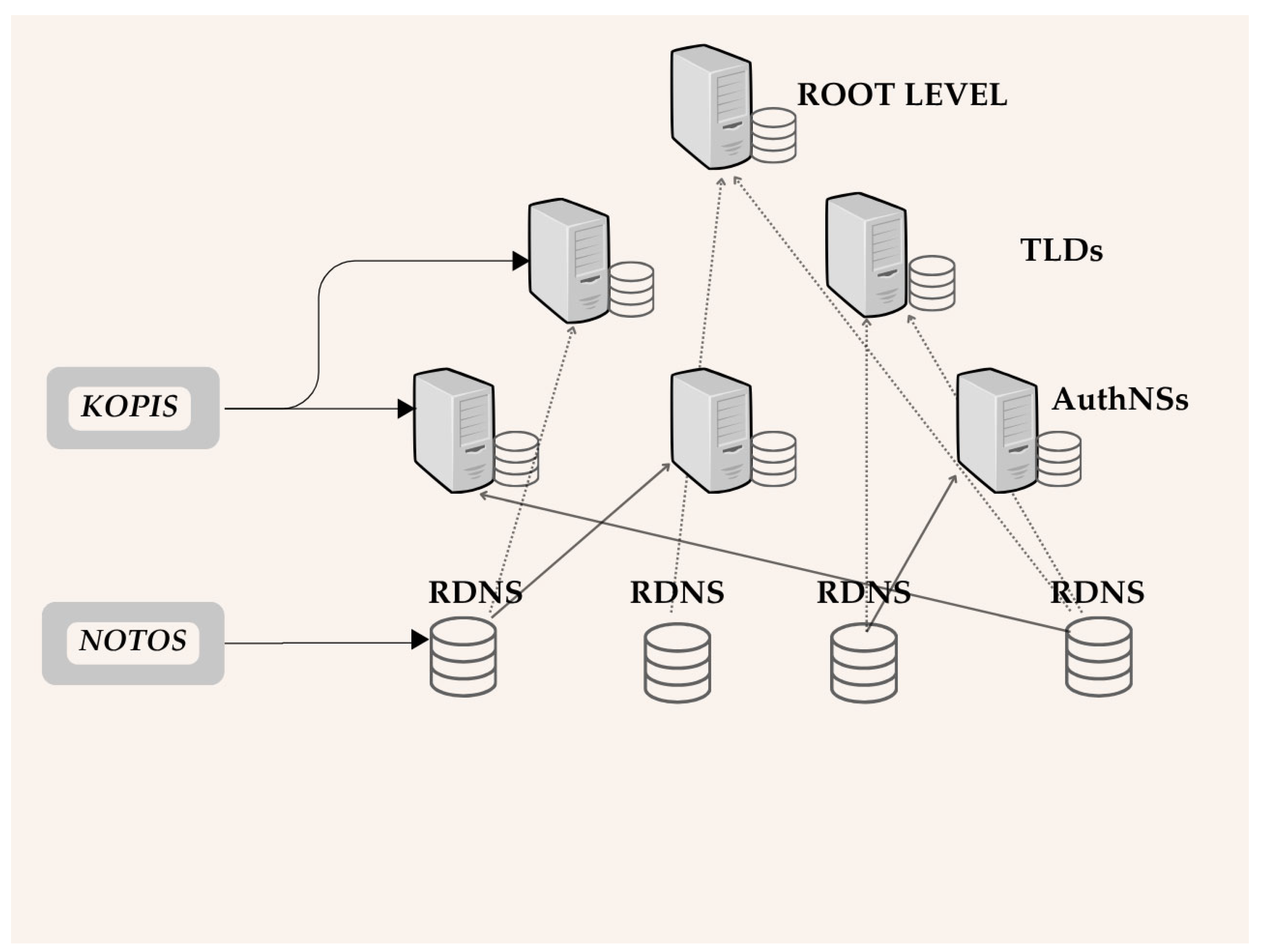 Figure 1 illustrates the monitoring layers within the DNS infrastructure. Notos observes domain resolution activity at the recursive resolver (RDNS) level, where client queries are aggregated. Notos analyses passive DNS data and infers reputation scores from domain to infrastructure relationships. In contrast, Kopis operates one tier higher, at the authoritative DNS server (AuthNS) level, where it inspects query patterns directed to authoritative servers and characterizes abnormal response behaviours. The hierarchical arrows in the figure represent the direction of DNS query propagation from RDNS to TLD and root servers illustrating how Kopis extends the Notos approach by shifting the monitoring perspective upstream to detect coordinated malicious activities earlier in the resolution process.