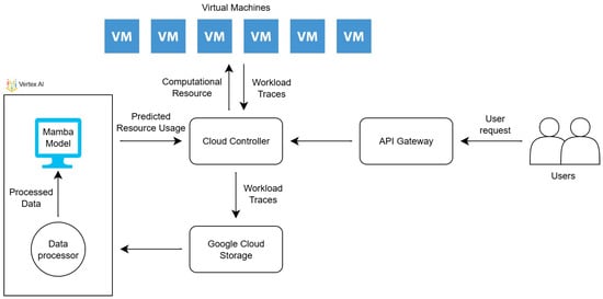 The operation begins with users interacting with the services provided by the cloud applications. These interactions are sent in as requests through Amazon’s Application Programming Interface (API) Gateway, which is then relayed to the cloud controller. The cloud controller provides computational resources to virtual machines that offer these services to users while monitoring resource usage simultaneously. The cloud controller would then store these workload traces in a bucket on Google Cloud Storage (GCS), where they can be easily retrieved. The CPU usage forecaster would then take the data into the Vertex AI environment, where the data is analysed, cleaned, and resampled for the model. The trained Mamba model then takes the processed data and makes predictions for future resource usage. Afterwards, the predictions are sent back to the cloud controller, which then provides the predicted resource requirements to the virtual machines.