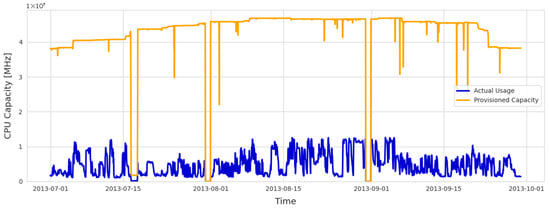 To highlight the gap between the used CPU capacity and the provisioned CPU capacity, the values of these two features from the 1750 available virtual machines were aggregated and plotted in Figure 2. The graph displays a stark difference between the two values, with the provisioned capacity being constantly higher than needed, indicating an almost constant state of over-provisioning. This is further supported through data analysis, where the average CPU usage was approximately 4,699,483 MHz, while the average provisioned CPU capacity was around 42,553,551 MHz, highlighting the extremely inefficient nature of resource utilisation in cloud computing.