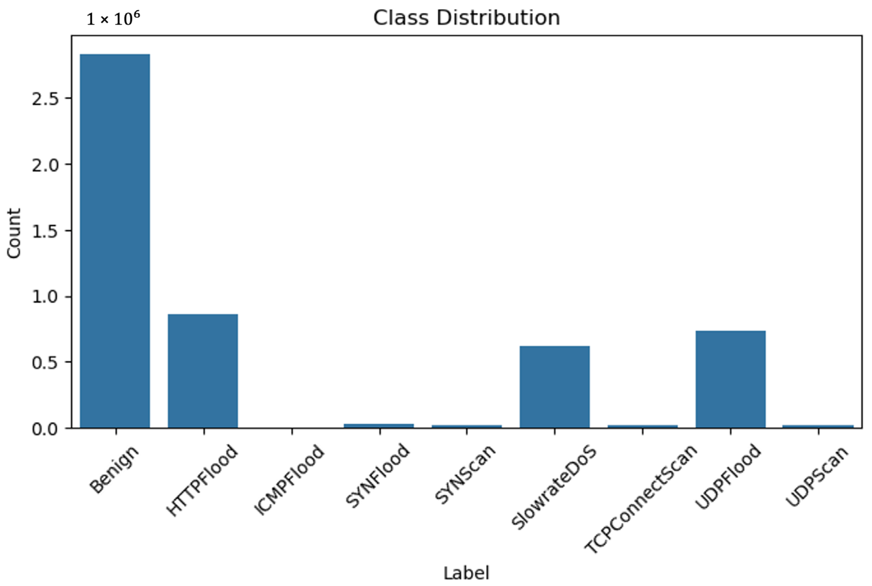 - Removal of Irrelevant Fields: Identifiers or metadata that are not contributing to anomaly detection, such as flow IDs, are removed. These features may introduce noise and affect the data modelling.