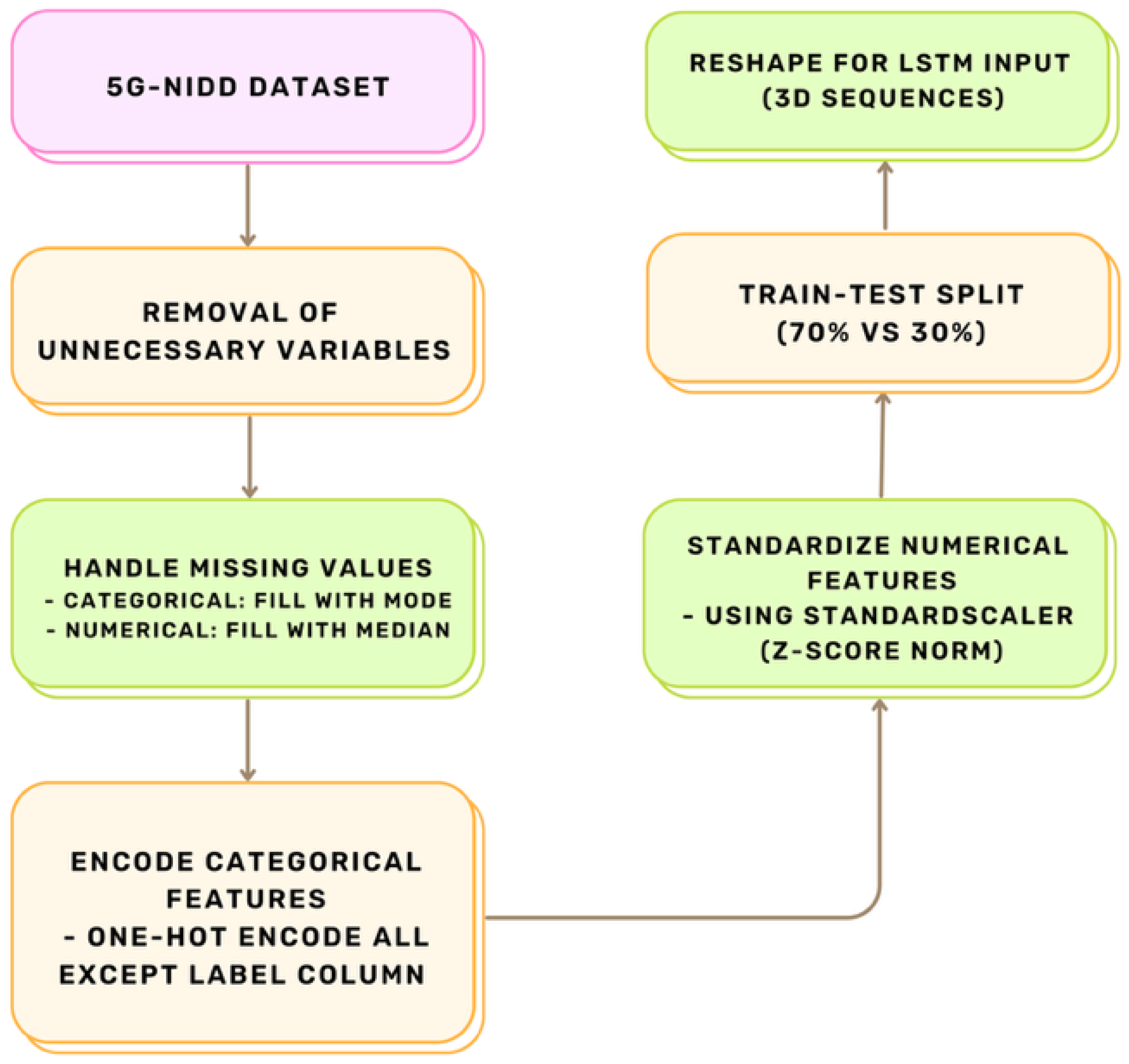 - Class Balancing: As mentioned previously, the 5G-NIDD dataset is imbalanced, with approximately 60% of flows labeled as attacks. Among the attack cases, some classes, such as ICMP Flood, account for less than 1% of all malicious flows. Oversampling methods such as SMOTE or ADASYN were explored but found to be impractical because of the dataset’s large scale (≈5.1 million flows) and their tendency to distort sequential dependencies across consecutive flows. Consequently, we use class weighting. Specifically, we weight the loss for each class by where N is the total number of samples, C is the number of classes (9), and N(C) is the number of samples in class c. This weighting scheme effectively mitigates imbalance while preserving the temporal structure of the sequences. Such preprocessing (label encoding, normalization, and class weighting) follows established best practices for telecom anomaly detection.
