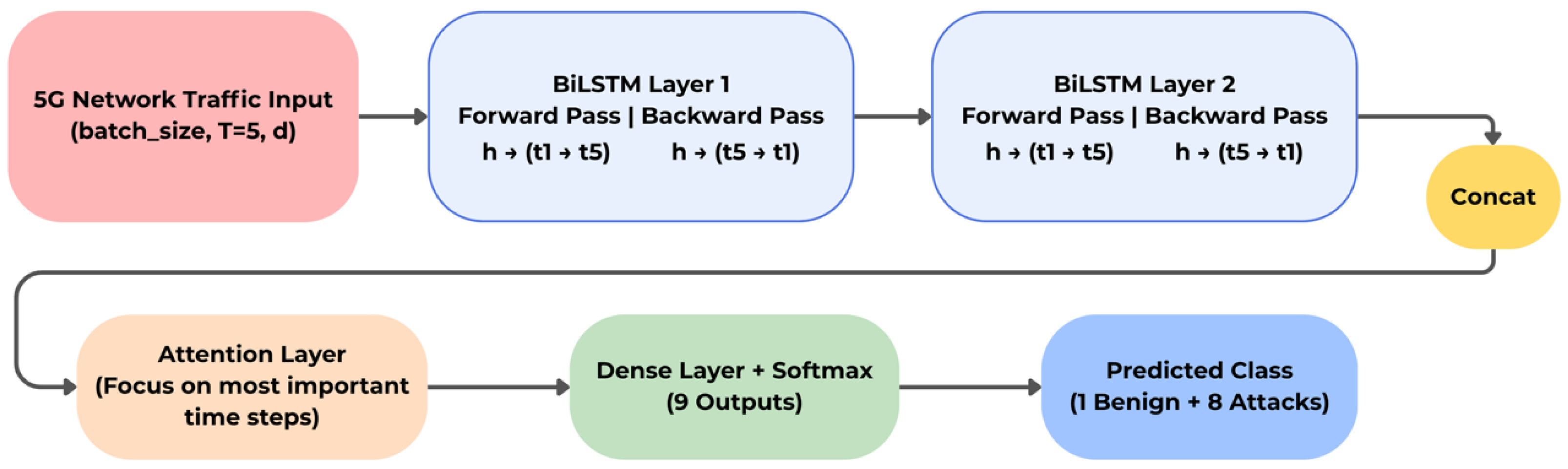 - Efficient Model Design:By employing bidirectional temporal encoding with attention and a reduced parameter count, BiTAD minimizes inference latency. Similar deep learning architectures, such as ScalaDetect-5G [36], have achieved F1 > 99% while supporting real-time deployment through feature compression and model optimization.