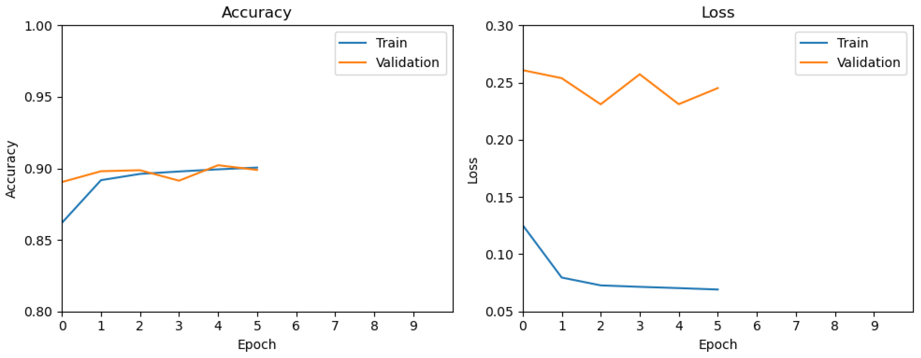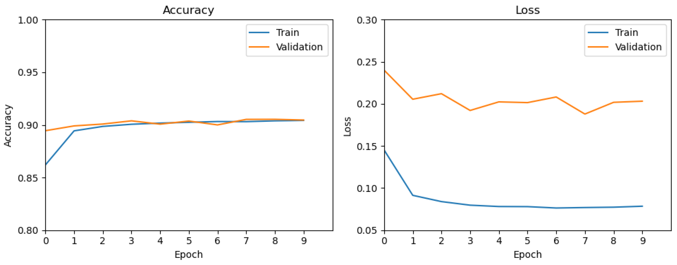 - Training Loss: Drops from ~0.15 to <0.075 over 9 epochs.