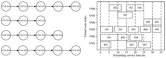 SFC instances have differentiated service requirements and need to be reasonably scheduled based on resource constraints, efficient utilization, and quality of service requirements. This paper investigates how to optimize scheduling algorithms in resource-constrained computing environments to achieve efficient VNF placement on heterogeneous virtual machines, thereby meeting the diverse requirements of different SFC instances. Assuming that there are four SFC instances with differentiated service demands for scheduling, namely, SFC1: VNF101–105, SFC2: VNF201–203, SFC3: VNF301–304, and SFC4: VNF401–405. The scheduling algorithm is required to perform dynamic mapping within a resource pool composed of six heterogeneous virtual machines (VM1–VM6), aiming to allocate VNFs in a demand-driven manner based on the predefined VNF–VM mapping relationships, under the constraint of limited computing resources. The VNF scheduling example is shown in Figure 2.