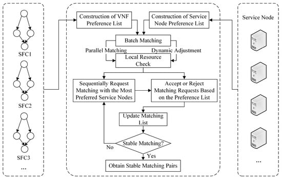 To solve the above problems, this paper introduces the Batch Matching strategy, which divides each round of the matching process into multiple batches based on the resource demands strategy and matches in parallel within each batch. Within each batch, all VNFs submit matching requests to the physical node simultaneously, while the physical node makes a unified decision to accept the optimal match according to the preference list after receiving all the requests to ensure the overall allocation efficiency. At the same time, the matching strategy of subsequent batches is optimized based on the matching results of the previous batch to reduce the probability of resource conflicts and to cope with complex scheduling scenarios such as dynamic and parallel computing environments more efficiently to enhance the global scheduling effect.