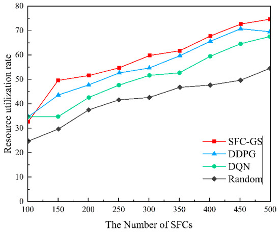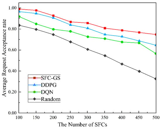 Figure 4 illustrates the trend of the average request acceptance rate with respect to the number of SFCs for different algorithms dealing with SFC scheduling. As the number of SFCs increases, the acceptance rate of all algorithms declines due to higher resource demands and increased scheduling complexity. However, the SFC-GS algorithm consistently outperforms the other three algorithms, achieving an average request acceptance rate that is more than 8.108% higher, thereby demonstrating a significant advantage. Batch-based matching enables SFC-GS to handle a large volume of requests more efficiently, while local resource checking helps prevent conflicts and resource waste during allocation. This mechanism ensures that data packets traverse multiple network service nodes as required by users, maintaining stable and reliable service delivery even under highly complex network conditions. So, the algorithm sustains a high acceptance rate under substantial request loads. In comparison, DDPG and DQN, as deep reinforcement learning algorithms, demonstrate superior performance in certain scenarios. However, in large-scale SFC scheduling, their learning complexity leads to less stable performance compared to SFC-GS. The Random algorithm allocates resources in a completely arbitrary manner without any optimization strategy, leading to the most rapid decline in the average request acceptance rate under intense resource competition.