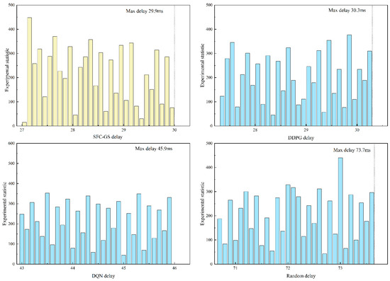 In the training process of this paper, to better simulate real-world network environments and conduct effective research under limited resources, the scenario with 300 SFCs was selected to evaluate the distribution of end-to-end delay. The distribution of training episode counts corresponding to specific latency levels is illustrated in Figure 6. The SFC-GS algorithm exhibits a higher frequency of lower latency occurrences and achieves the lowest maximum latency among all compared algorithms, indicating its clear advantage in mitigating latency escalation trends. The analysis of the experimental data distribution, shows that SFC-GS has a large statistic of small end-to-end delay bias and the lowest end-to-end delay compared to other algorithms. These results demonstrate that SFC-GS exhibits significant stability in latency control for SFC scheduling. Meanwhile, SFC-GS reduces computational redundancy through local resource checking, iteratively refines the matching process over multiple rounds to approximate the global optimum, and enhances allocation efficiency via batched parallel processing. This approach effectively avoids premature acceptance of locally optimal requests that may lead to global resource imbalance, thereby significantly improving the overall network latency performance.
