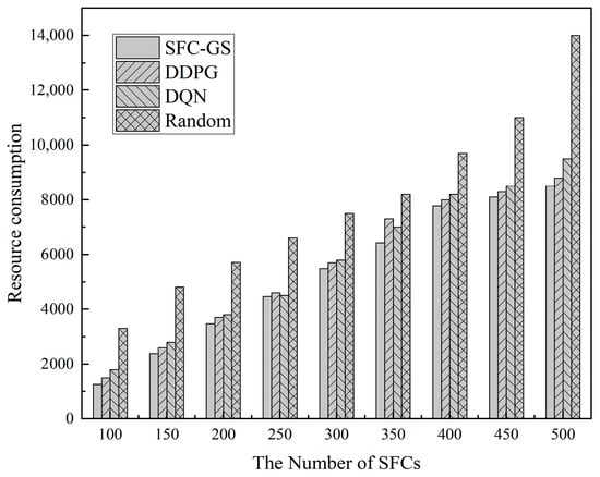 The resource consumption under varying service request arrival intensities is illustrated in Figure 9. As the number of SFCs increases, the overall resource consumption also rises, which aligns with the principle that resource demand is positively correlated with the scale of SFC deployments. The highest resource consumption observed in the Random algorithm indicates that scheduling without an optimization strategy results in significant resource waste. In this paper’s algorithm, the matching strategy of each batch optimizes the subsequent batch matching process, thereby enhancing the overall resource utilization efficiency. The reinforcement learning algorithm optimizes resource scheduling, but the resource consumption is still higher than that of SFC-GS due to the fact that there are still redundant computations during training and inference. Through the optimization of batch matching and local resource inspection, SFC-GS achieves lower resource consumption compared to DQN, DDPG, and Random algorithms. In large-scale SFC scheduling scenarios, SFC-GS reduces resource consumption by approximately 10.5–15%, demonstrating higher resource utilization and scheduling efficiency, making it a superior choice for scheduling algorithms.