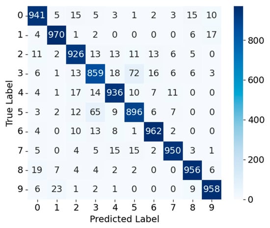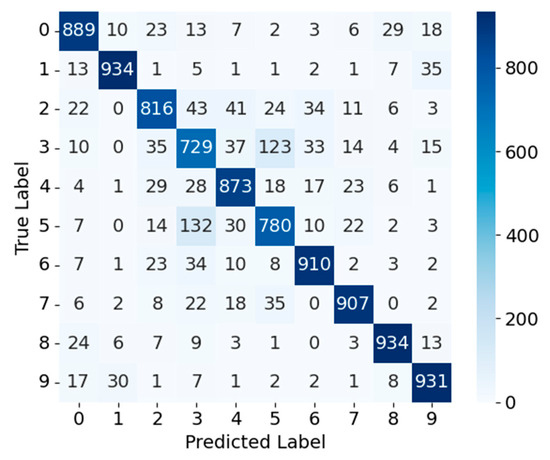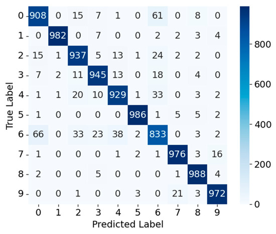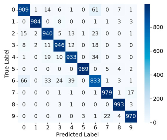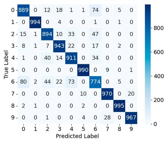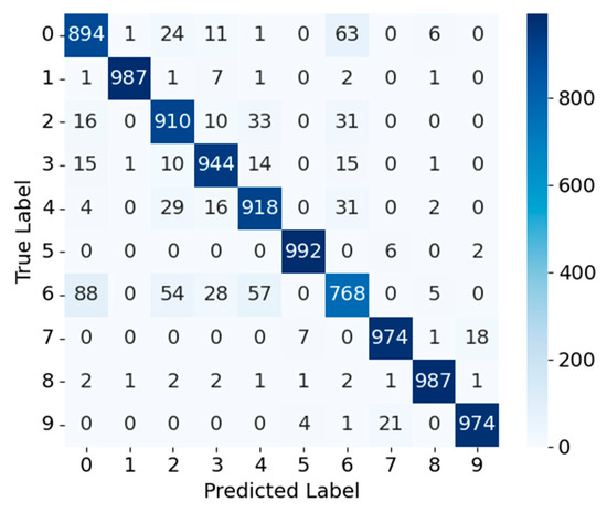Fashion-MNIST—Figure 3 and Figure 4 show the confusion matrices for MobileNetV3_CA and MobileNetV3_CA_Pruned on the Fashion-MNIST dataset. For MobileNetV3_CA, most samples are concentrated along the diagonal, reflecting high classification accuracy; for instance, class 0 and class 1 have 911 and 989 correctly classified samples, respectively. A notable exception is class 6, which exhibits higher misclassification rates into classes 0, 4, and 2, indicating difficulty in distinguishing structurally similar apparel items. After pruning, the MobileNetV3_CA_Pruned model maintains comparable overall performance, with class 0 and class 1 achieving 909 and 984 correct classifications, respectively. The correct classification counts for other classes remain largely unchanged, and the misclassification patterns of class 6 into classes 0, 4, and 2 are similar to those observed before pruning. Overall, channel pruning exerts minimal impact on most categories, with only a modest reduction in fine-grained discrimination for visually similar classes. Consequently, pruning strength should be carefully tuned to balance lightweight design and classification accuracy, ensuring a favorable accuracy–efficiency trade-off for deployment in resource-constrained environments.
