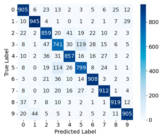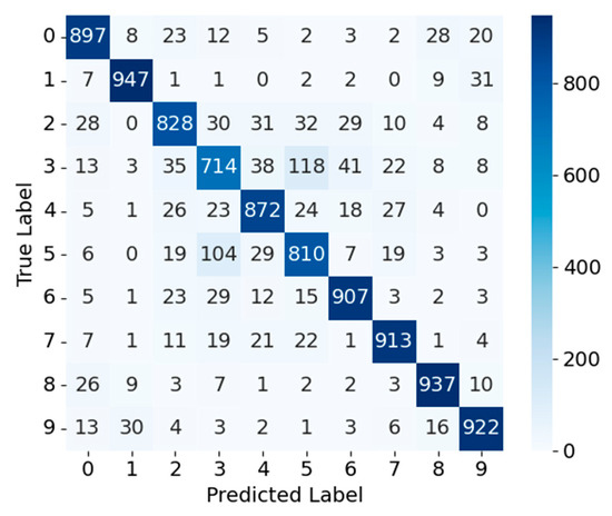 CIFAR-10—Figure 7 and Figure 8 present the confusion matrices for RepVGG_CA and RepVGG_CA_Pruned on the CIFAR-10 dataset, respectively. For RepVGG_CA, most samples are concentrated along the diagonal, indicating high classification accuracy; for example, class 0 has 905 correctly classified samples and class 1 has 945. Misclassifications are relatively minor, with only limited confusion between visually similar categories. After pruning, RepVGG_CA_Pruned maintains similar performance for most classes (e.g., class 0: 897, class 1: 947) but shows a slight increase in confusion for certain categories, such as class 3 being misclassified as class 5, and increased confusion between classes 2 and 4. These changes suggest that pruning may slightly weaken fine-grained feature discrimination for visually similar categories. Consequently, pruning strength should be carefully tuned to balance lightweight design and classification accuracy, particularly when mitigating confusion among visually similar objects, ensuring a favorable accuracy–efficiency trade-off for deployment in resource-constrained environments.