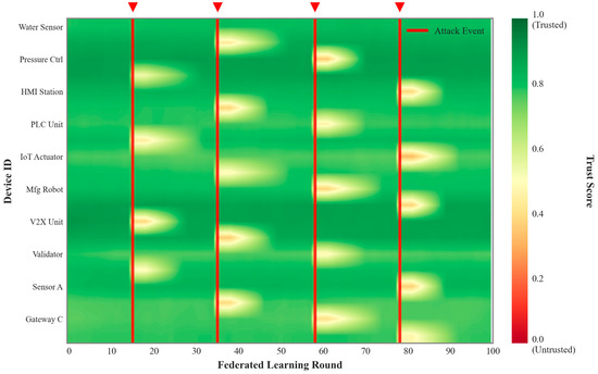 The security analysis reveals consistently high detection rates across all attack categories derived from the three datasets. Traditional network attacks from SWaT and TON IoT (DoS, MitM, backdoor, injection, ransomware) achieve detection rates between 93.8% and 97.8%. Notably, the synthesized federated learning attacks show even higher detection rates, with model poisoning achieving 98.9% detection due to the quantum trust modeling’s sensitivity to behavioral anomalies in collaborative learning scenarios.