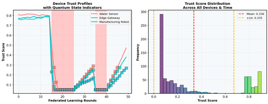Quantum Trust Observable: Each device’s trust value is derived from a Hermitian-based observable that assigns reliability weights to its operational and behavioral attributes. These trust weights are continuously updated according to past participation and consistency in federated aggregation.