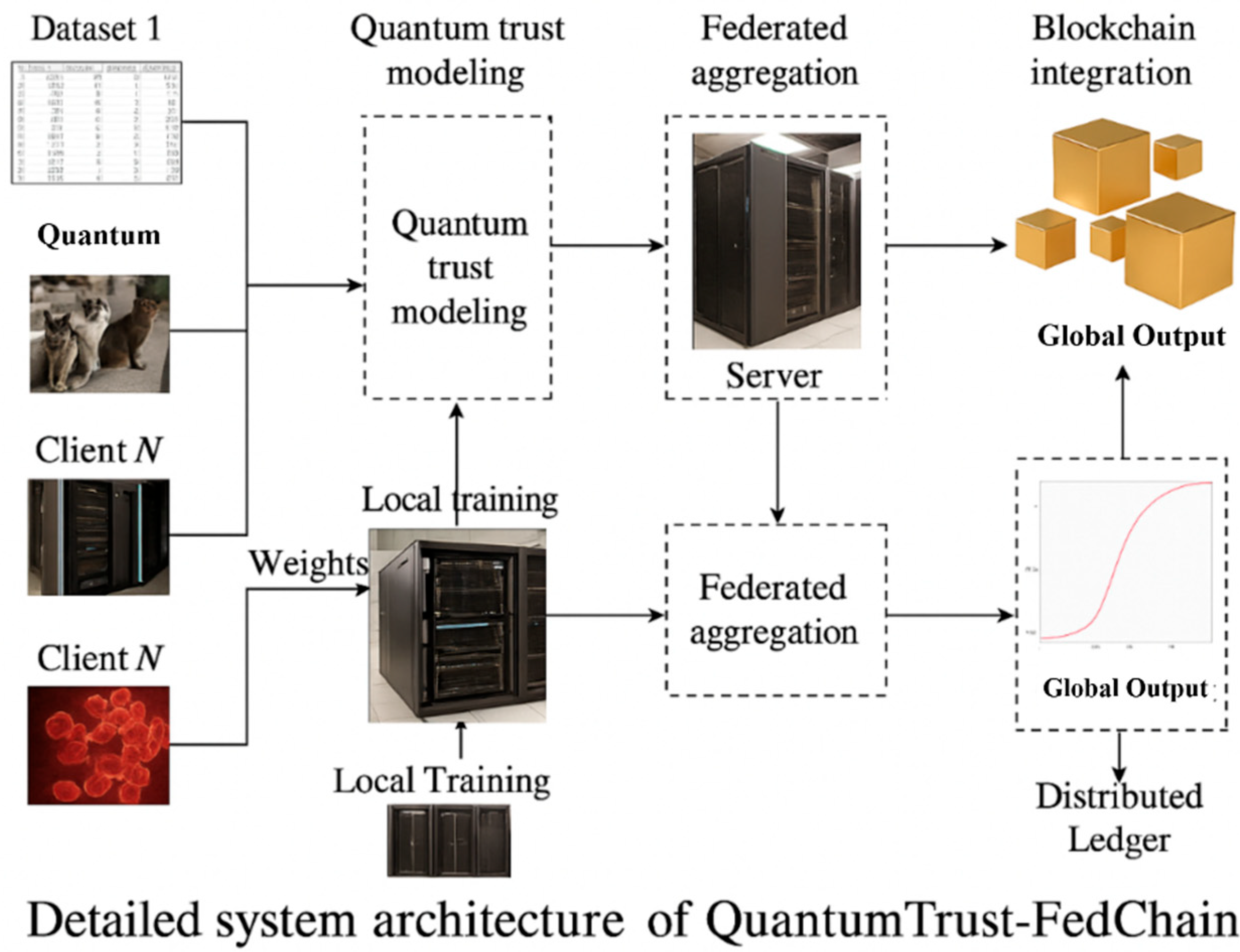 Software Stack: Model development leveraged Python 3.10, PyTorch 2.2.1, and Qiskit 0.45.1 for variational quantum circuits. Blockchain simulations used Hyperledger Fabric 2.5, and federated learning orchestration was managed using Flower 1.8.