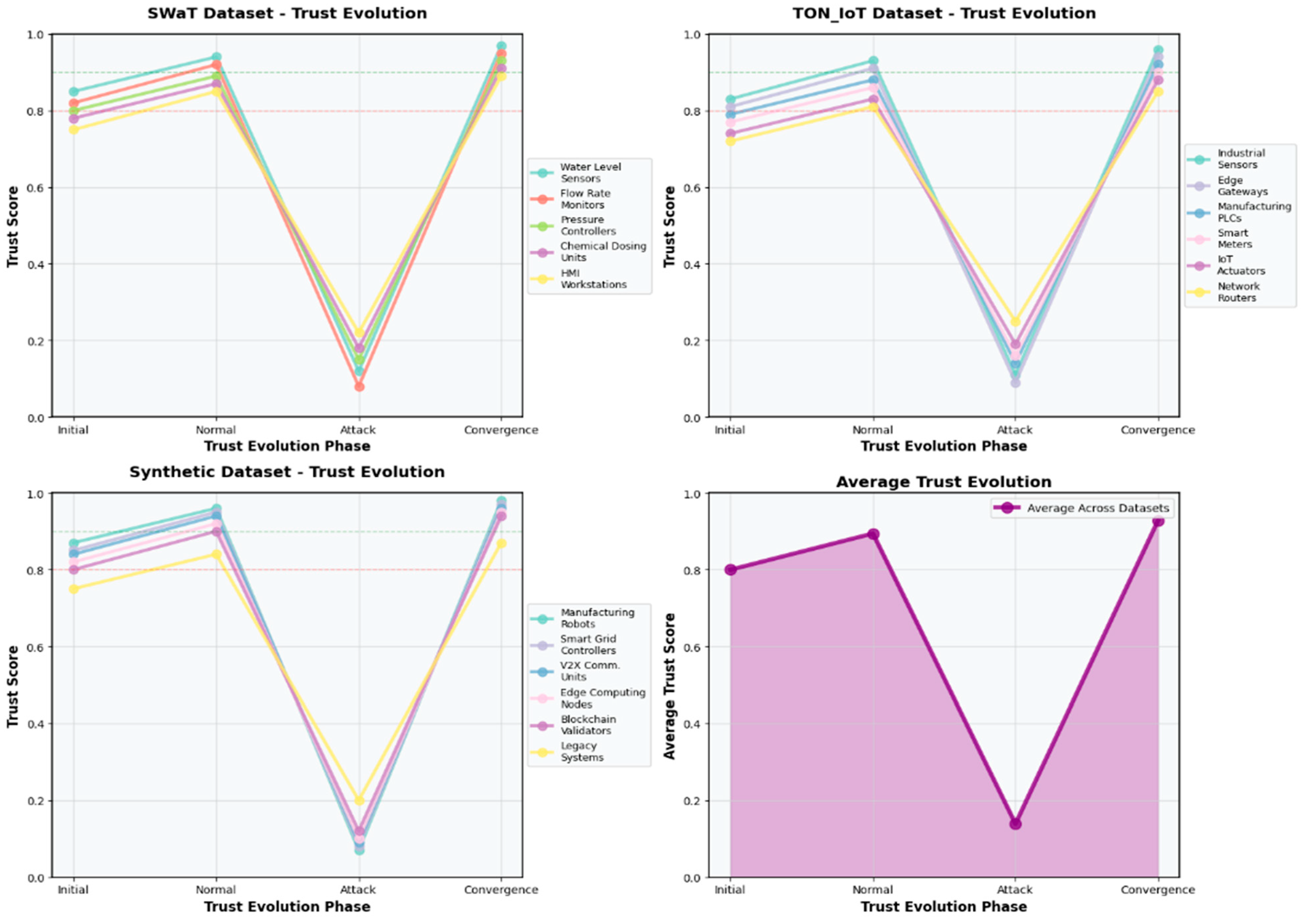 The trust modeling effectiveness was evaluated through correlation analysis between computed trust scores and ground truth reliability metrics across all datasets. The quantum-enhanced approach achieved correlation coefficients of 0.92 (SWaT), 0.93 (TON IoT), and 0.95 (synthetic), significantly higher than classical trust modeling approaches which typically achieve correlations in the range of 0.75–0.85 across similar industrial datasets.