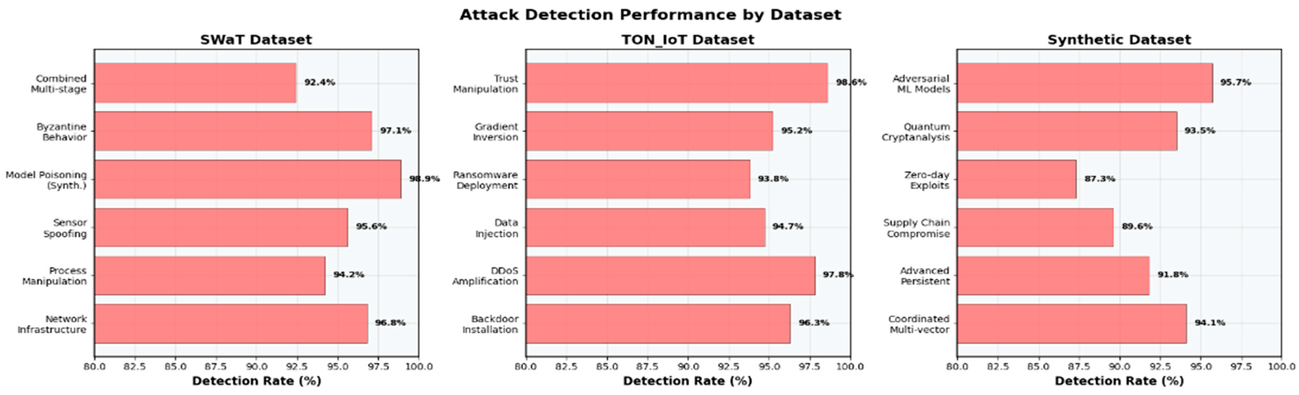 Figure 5 compares the attack detection rates of QuantumTrust-FedChain across the SWaT, TON IoT, and synthetic datasets under diverse adversarial scenarios. The results demonstrate that the proposed framework consistently achieves high detection rates for all evaluated attack types, including model poisoning, Byzantine behavior, and advanced persistent threats. Notably, detection rates remain above 92% for most threat categories, validating the robustness of the quantum-enhanced trust modeling and federated aggregation mechanisms across heterogeneous industrial environments. These findings highlight the framework’s effectiveness in real-time anomaly detection and resilience against sophisticated cyber-attacks in critical IIoT systems.