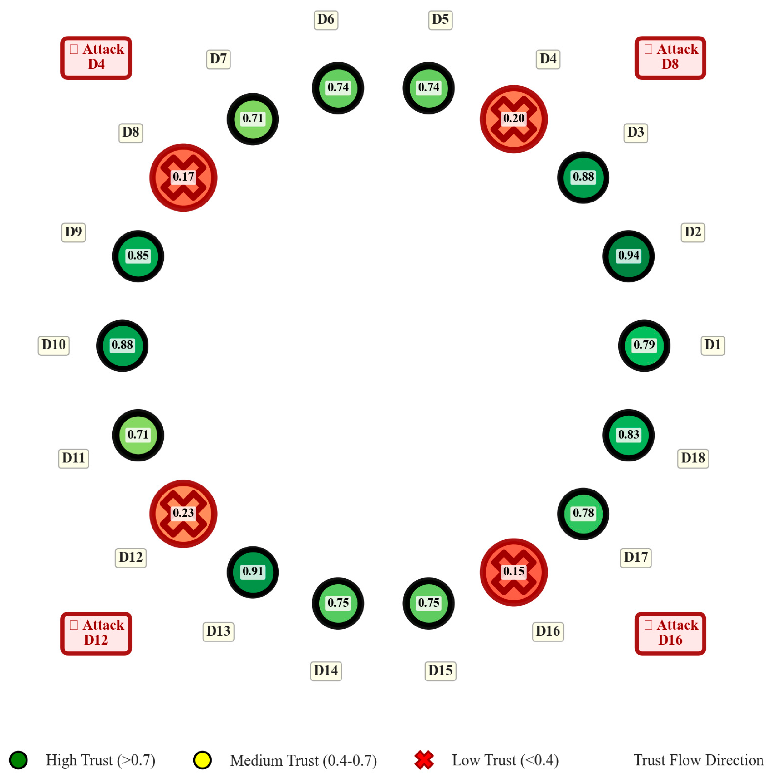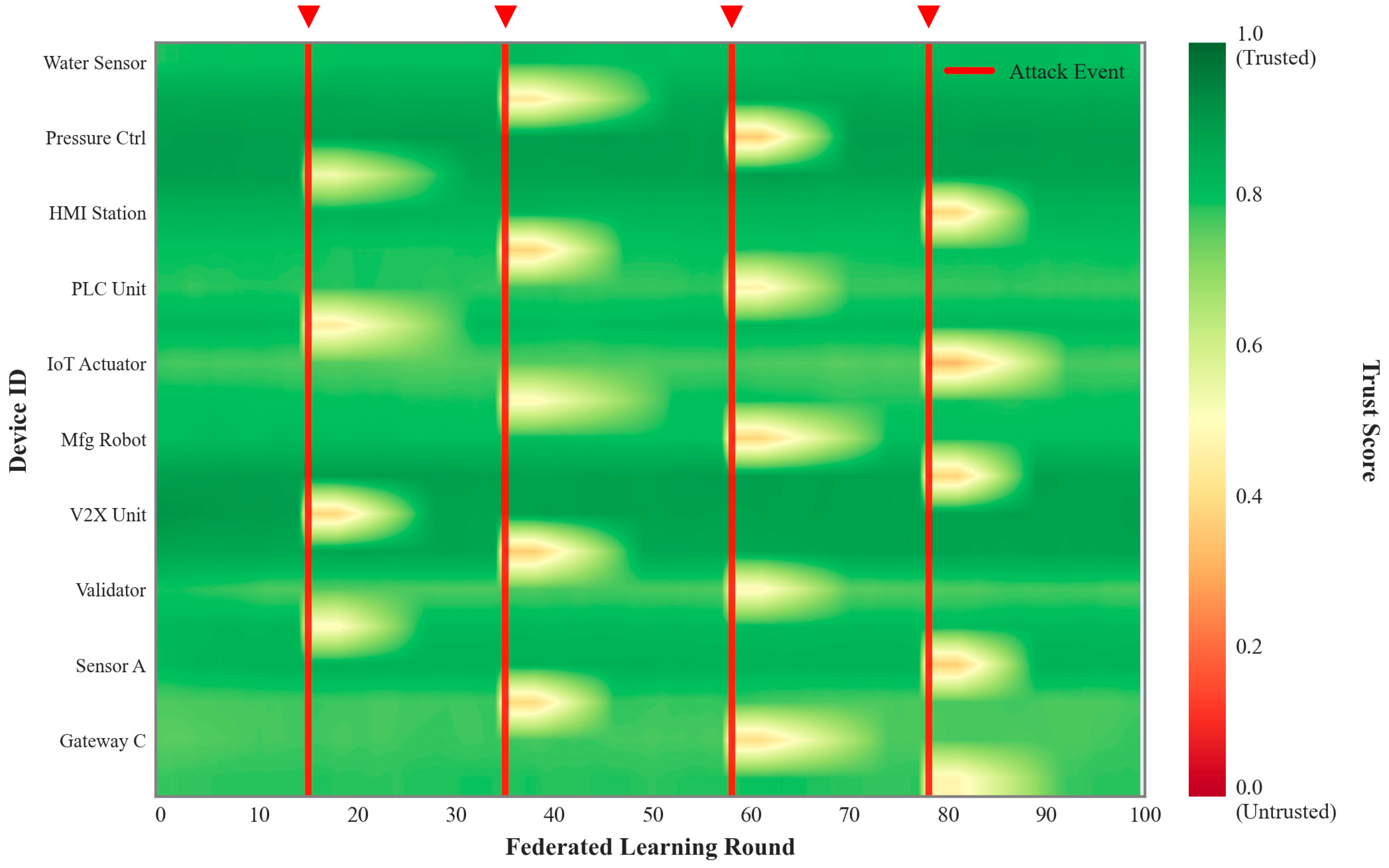 Figure 7 presents the temporal evolution of trust scores for multiple device types as a heatmap, where vertical red lines indicate attack occurrences. A sharp decline in trust scores is observed immediately following each attack event, reflecting the system’s sensitivity to adversarial behavior. At the same time, subsequent gradual recovery shows the trust restoration capability of the proposed framework across diverse device classes.