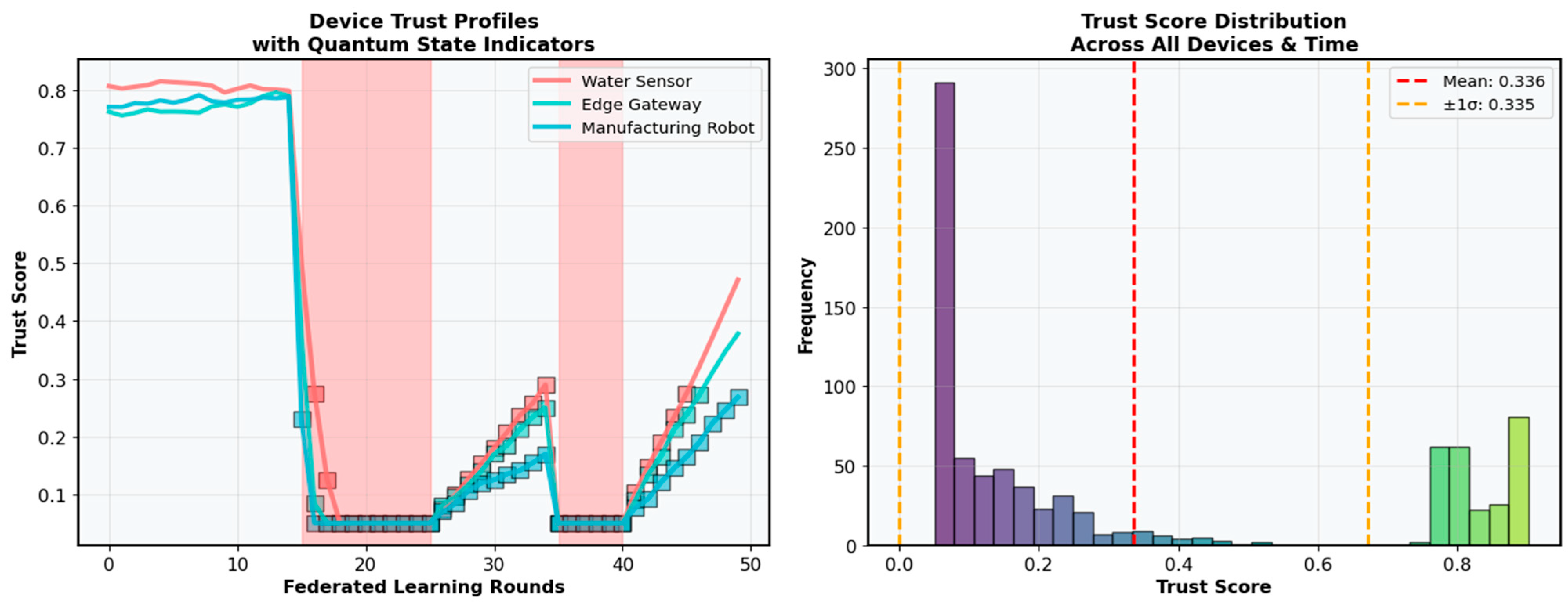 Figure 8 presents the trust score dynamics for representative device types (water sensor, edge gateway, and manufacturing robot) across federated learning rounds, and the corresponding trust score distribution across all devices and time. Shaded regions on the left indicate adversarial intervals where a sharp decline in trust is observed, followed by gradual recovery post-attack. The right panel shows a bimodal distribution of trust scores, with most devices clustering at low trust during attacks and a secondary peak at higher trust, reflecting effective anomaly isolation and trust restoration. Mean and deviation thresholds are highlighted with dashed lines.