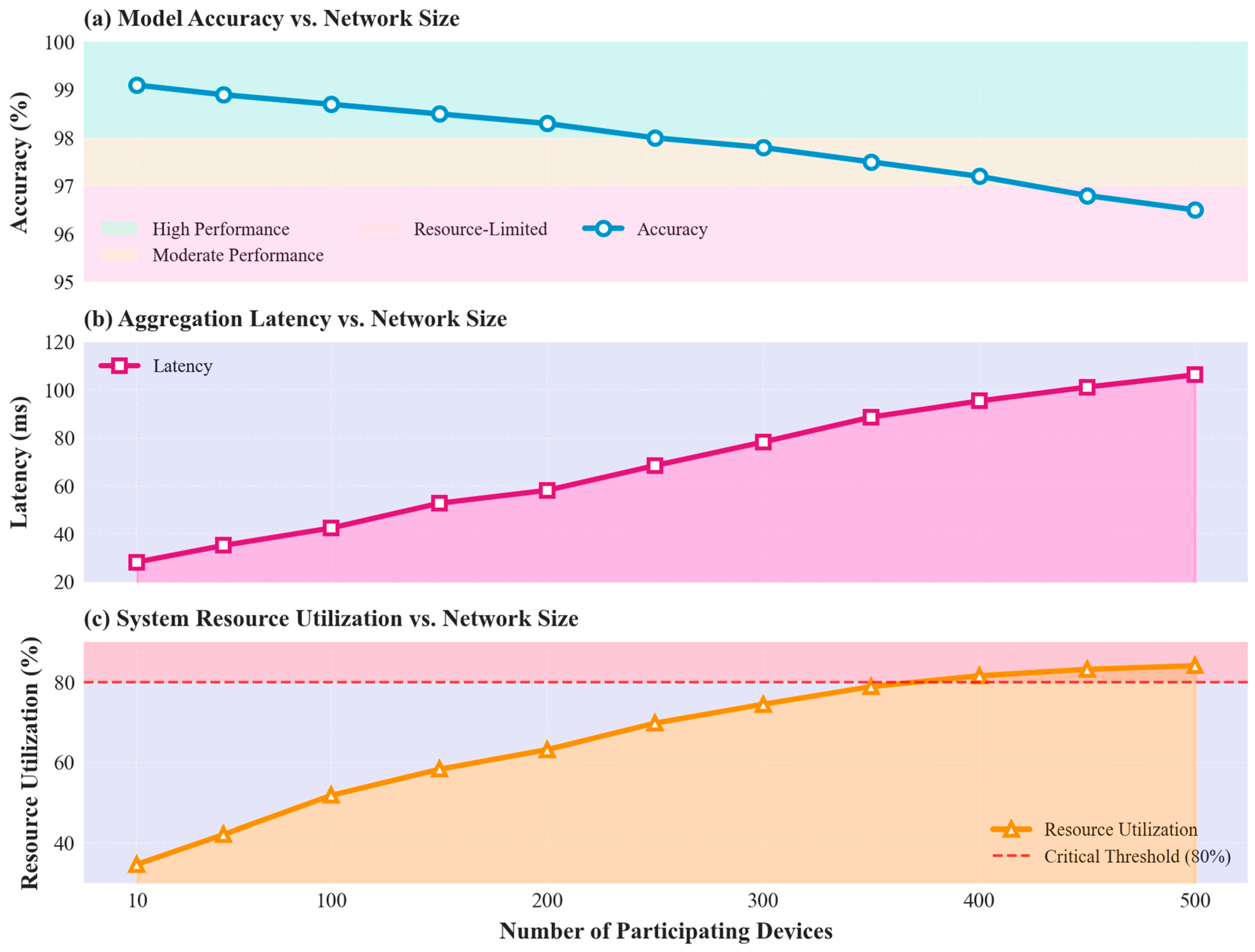 ). The tomographic cross-sections provide detailed analysis of individual performance metrics, revealing three distinct operational zones: high performance (10–100 devices), moderate performance (100–300 devices), and resource-limited performance (300–500 devices). Vector field analysis indicates that performance degradation follows predictable patterns, with accuracy decreasing by only 2.6%. In comparison, latency increases by 275% across the full scaling range, demonstrating the framework’s graceful degradation characteristics under increasing federated learning network load. The scalability matrix