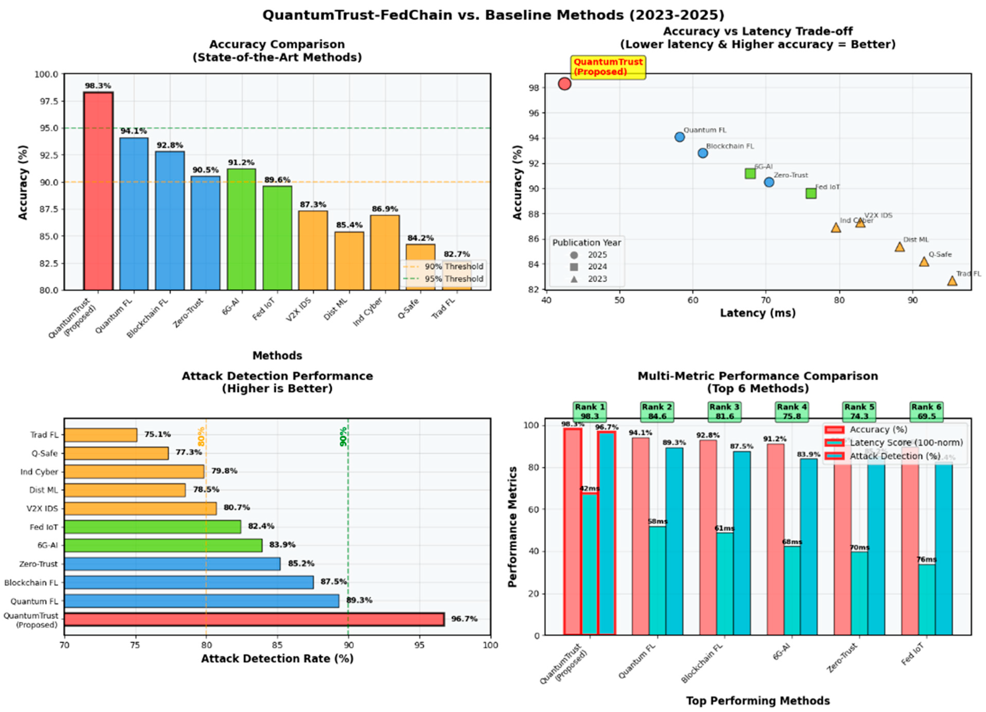 Figure 10 summarizes the comparative evaluation of QuantumTrust-FedChain against ten recent baseline methods, highlighting its superior accuracy (98.3%), highest attack detection rate (96.7%), and lowest latency among all approaches. The accuracy vs. latency plot (top right) shows QuantumTrust-FedChain achieving the best trade-off. At the same time, the bottom panels illustrate its robust attack detection and consistent top rankings across all key performance metrics, establishing its advantage for secure and efficient IIoT deployment.