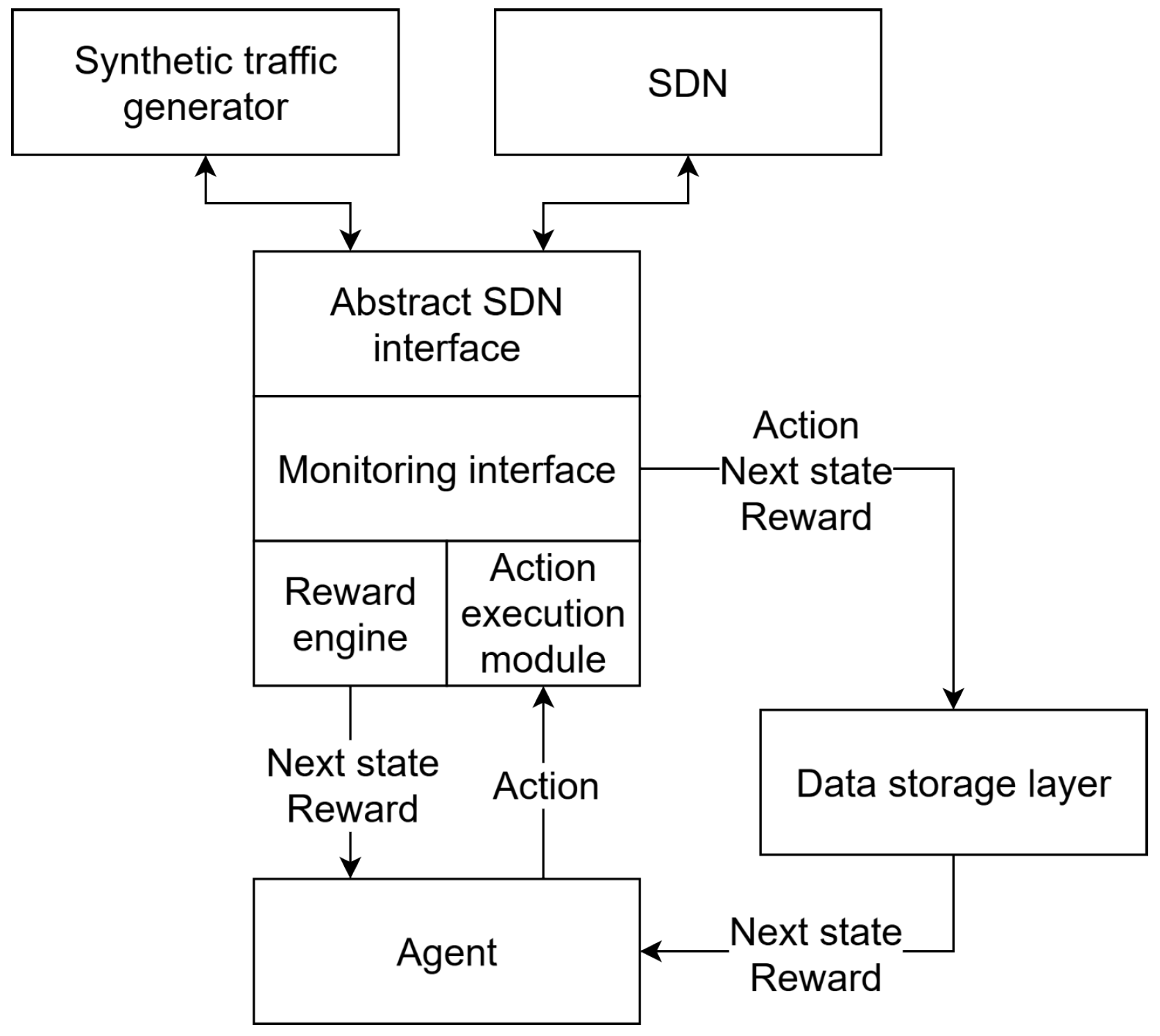Modular SDN Interface—we introduce an abstract SDN interface that enables plug-and-play connection of RL agents to SDN controllers, bridging the gap between theoretical research and practical deployment.