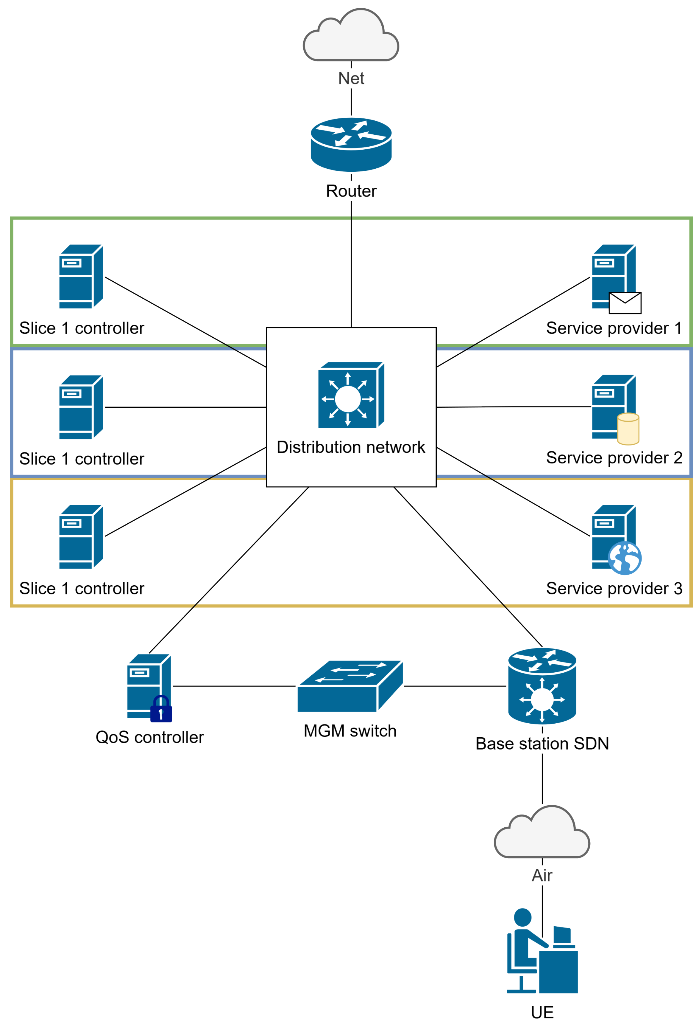 Figure 4). The environment instantiates three logically isolated slices, each governed by its own SDN controller responsible for intra-slice routing, access control, and packet management. To make the design more realistic, it allows users to subscribe to multiple service options at the same time. This way, they can use services from different providers. At the subscriber edge, each user equipment (UE) hosts an SDN-capable switch with a 6G modem and exposes dedicated uplink and downlink queues per subscribed slice, enabling fine-grained QoS enforcement.