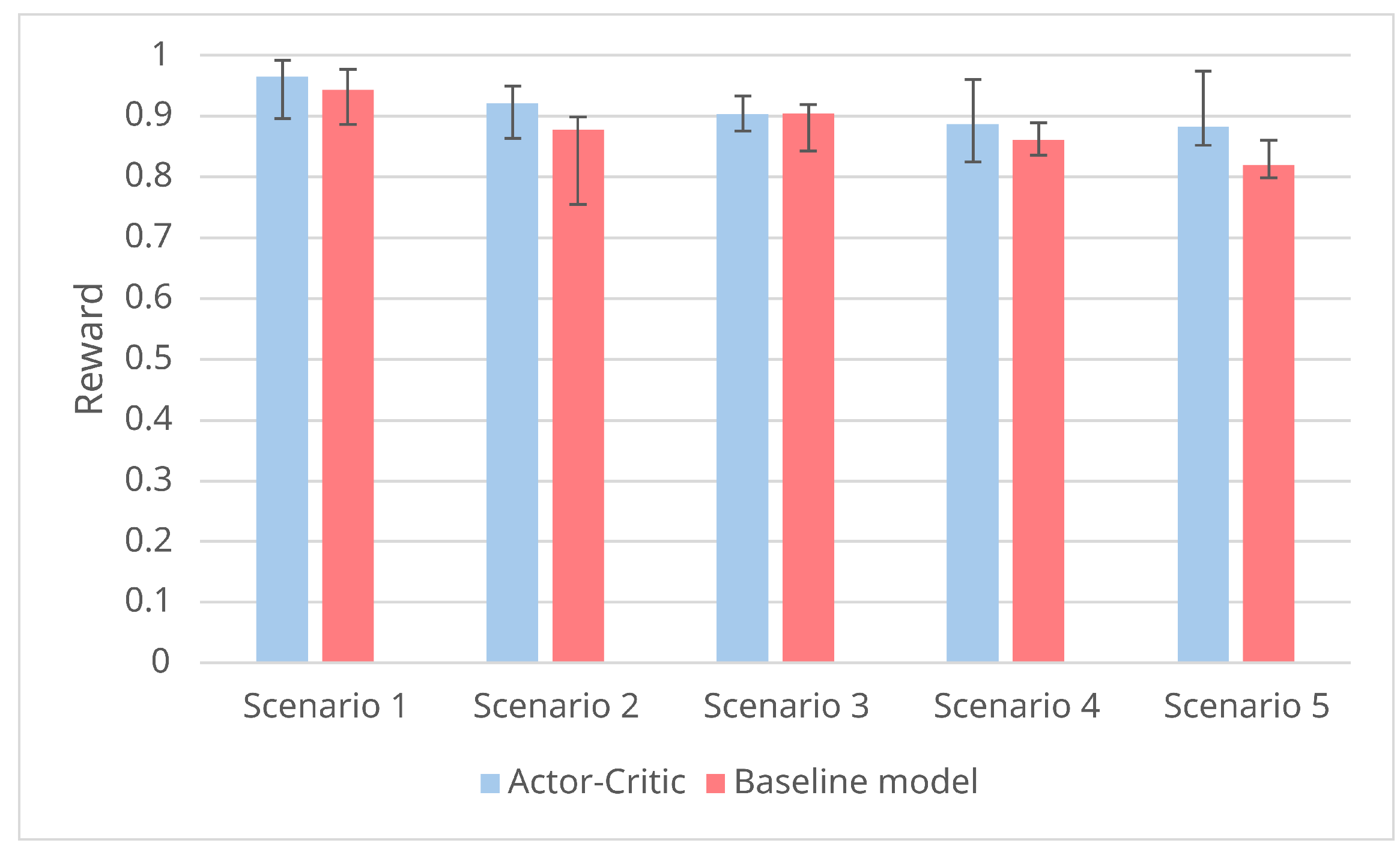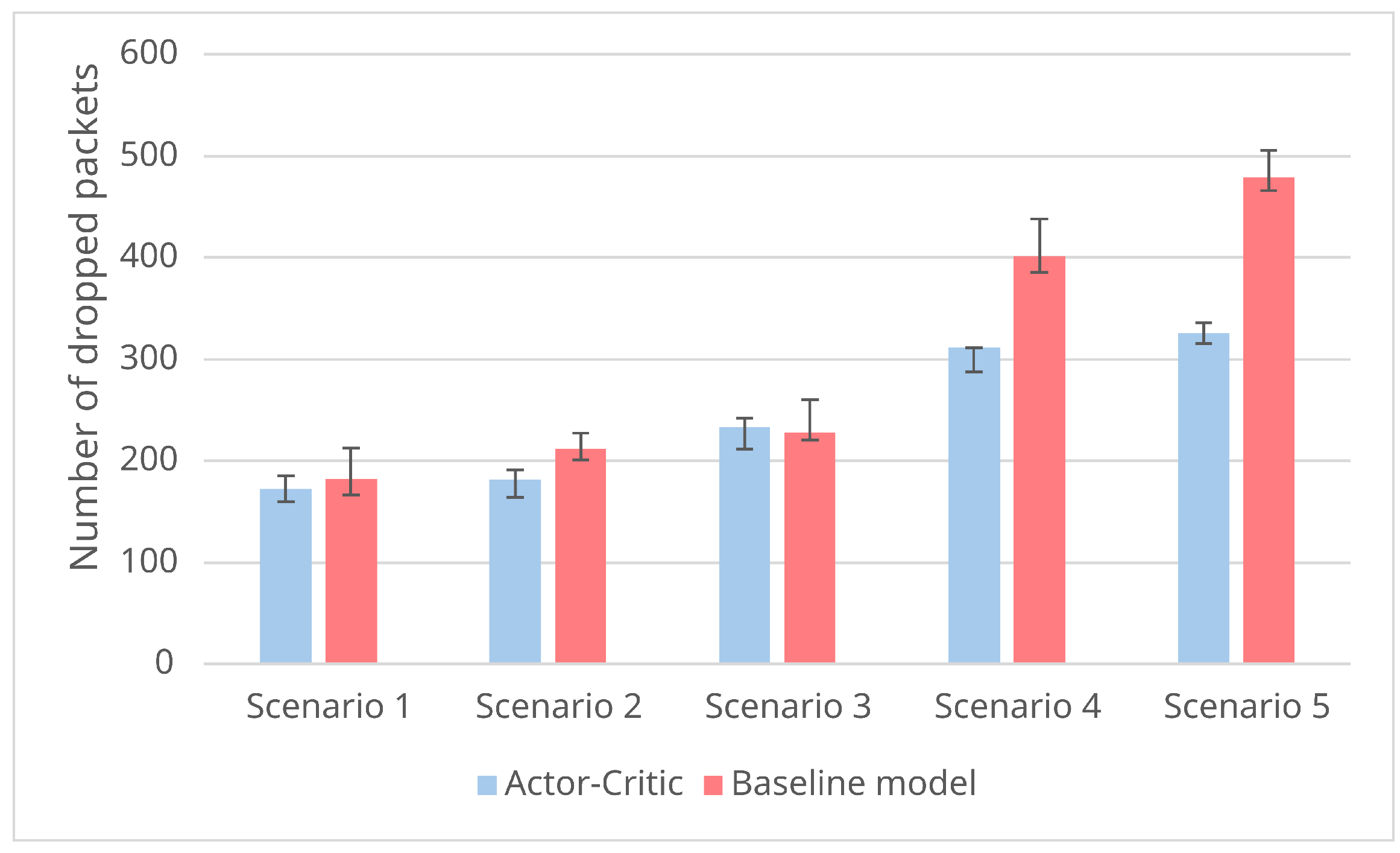 The performance of resource scheduling is evaluated by comparing the average reward, the cumulative number of dropped packets, and the amount of overestimated needed bandwidth per queue. The models are evaluated in five different scenarios. Although the last metric is not as important as the number of dropped packets, it provides an insight into the different behavior of the baseline model and our model in scenarios where resources are abundant. For each of these metrics, fully trained models running in inference mode are evaluated. Additionally, in case of the actor–critic model, only the actor network was used for evaluation, since the critic network is only relevant during training. Both models were run 3 times for 1000 time steps, and the average for all of the runs was calculated.