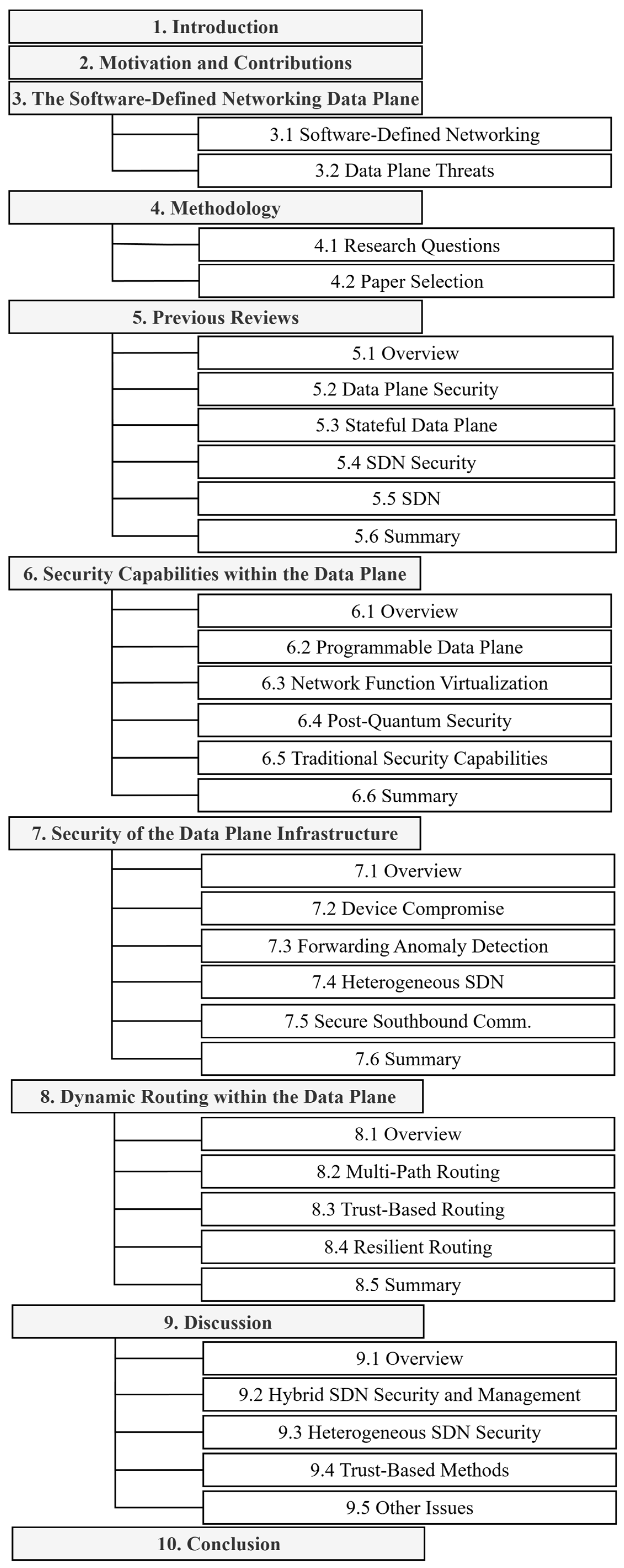 - We provide the first in-depth review of existing literature in SDN data plane security, encompassing over 300 relevant and high-quality sources.