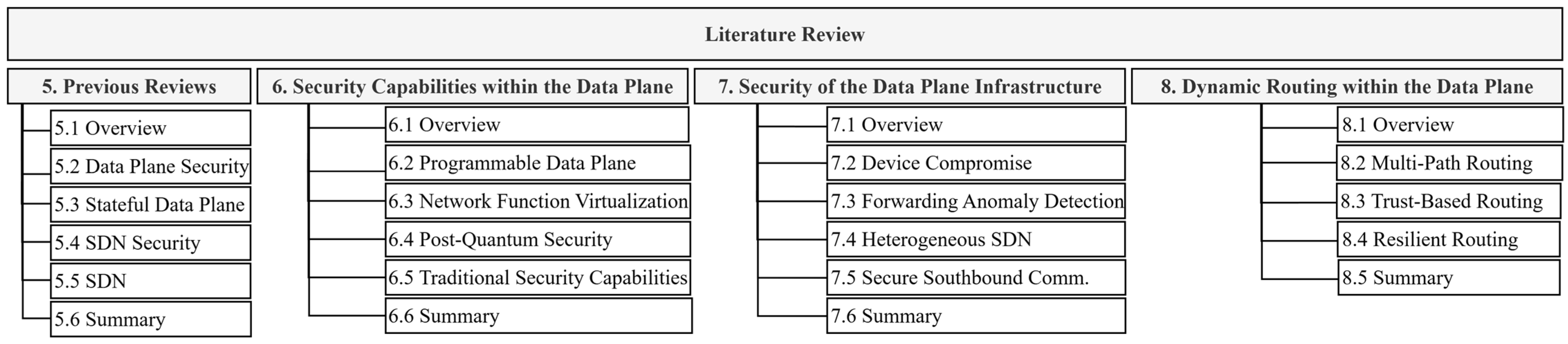 - Tankovic, A.; Dervisevic, E.; Mehic, M.; Kaljic, E. A survey on data plane security in software-defined networks: Twoard adaptive security of data planes. IEEE Access 2025, 13, 97058–97093. [Google Scholar] [CrossRef]