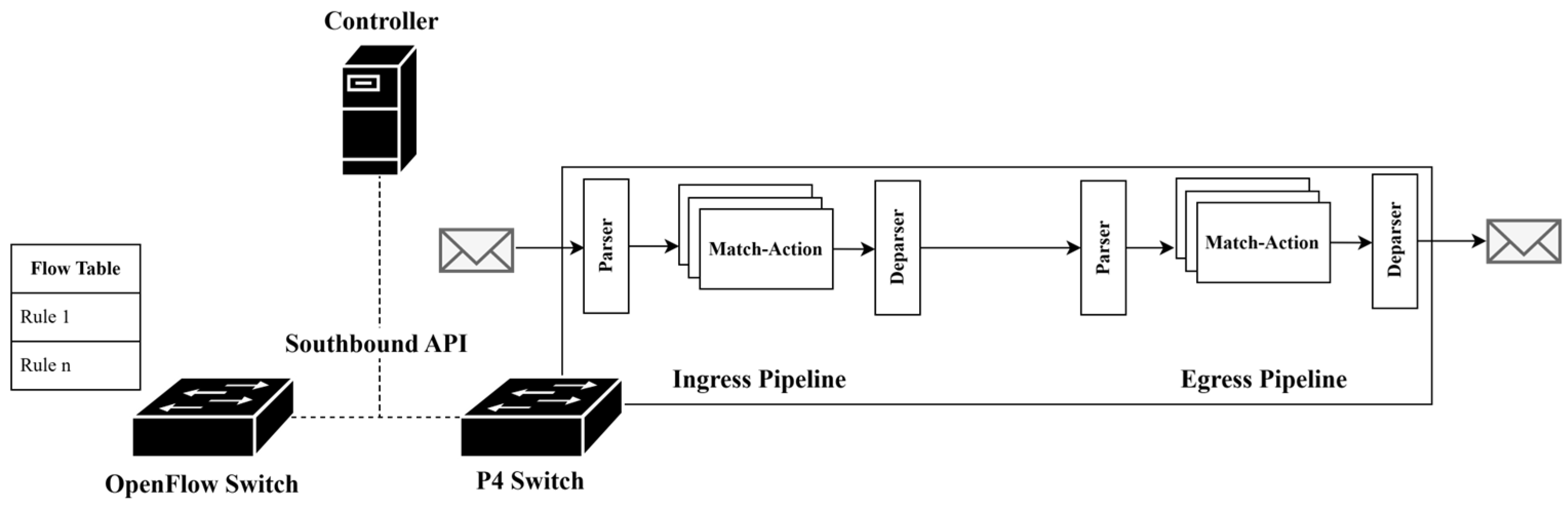 - Bosshart, P.; Daly, D.; Gibb, G.; Izzard, M.; McKeown, N.; Rexford, J.; Schlesinger, C.; Talayco, D.; Vahdat, A.; Varghese, G.; et al. P4: Programming protocol-independent packet processors. ACM SIGCOMM Comput. Commun. Rev. 2014, 44, 87–95. [Google Scholar] [CrossRef]