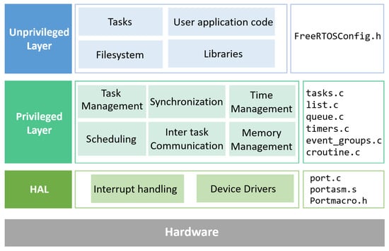 To manage embedded applications with strict timing and reliability requirements, RTOSs are commercially developed to provide a high degree of determinism and predictability for executing tasks in real-time. As an open-source and well-known RTOS, FreeRTOS [,] was created by Richard Barry and first released in 2003 under the MIT license. As shown in Figure 1, it employs a layered architecture that separates privileged kernel functions from the unprivileged layer and hardware abstraction (HAL) to provide portability across microcontrollers. The unprivileged layer hosts user applications, libraries, and drivers, interfacing with the kernel via well-defined APIs. The privileged layer forms the kernel core, managing task scheduling, synchronization, inter-task communication, and dynamic memory allocation, with kernel objects like tasks, queues, and semaphores allocated at runtime to optimize resource use. At the lowest level, the HAL abstracts hardware-specific details, enabling portability across various microcontrollers by handling low-level tasks such as interrupt management, context switching, and timer control. FreeRTOS offers a variety of services tailored to the constraints and requirements of embedded systems, including dynamic memory allocation, task management, inter-task communication, and resource sharing. These services ensure efficient memory use, deterministic task execution, seamless communication, and effective resource management among tasks.