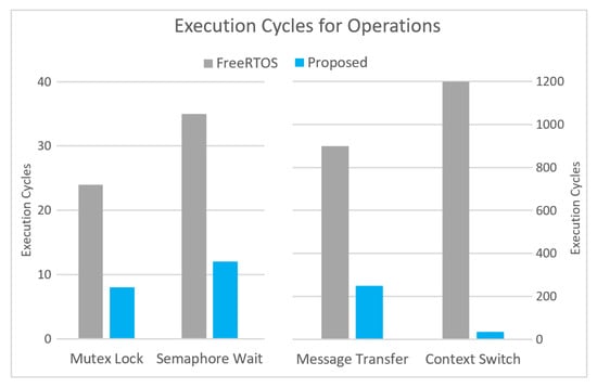 Figure 4 further illustrates these performance trends by plotting execution cycle counts for key operations. The proposed ITC model consistently outperforms baseline FreeRTOS, delivering up to a threefold reduction in mutex lock latency and over 70% improvement in message transfer efficiency. Notably, while message transfer latency scales linearly with message size, the proposed model maintains substantially lower per-byte overhead compared to traditional implementations. This linear scaling, combined with a lightweight synchronization design, ensures sustained high performance even for larger messages.