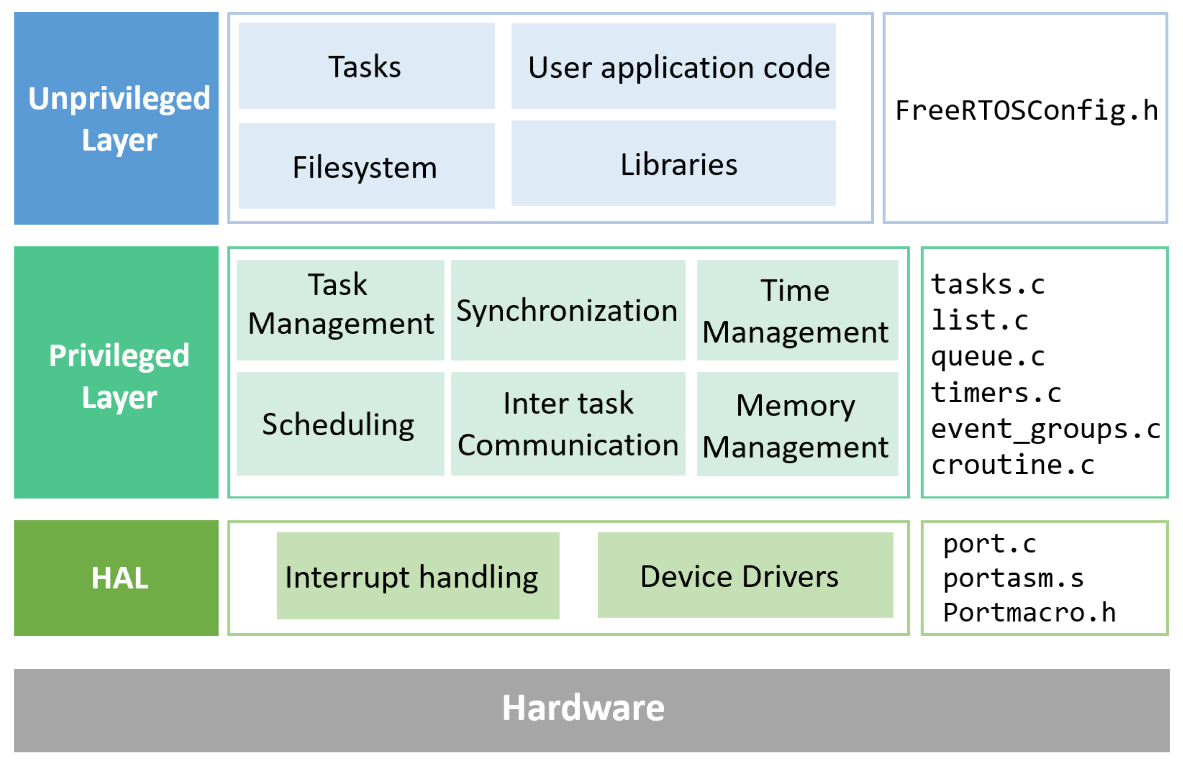 Figure 1, it employs a layered architecture that separates privileged kernel functions from the unprivileged layer and hardware abstraction (HAL) to provide portability across microcontrollers. The unprivileged layer hosts user applications, libraries, and drivers, interfacing with the kernel via well-defined APIs. The privileged layer forms the kernel core, managing task scheduling, synchronization, inter-task communication, and dynamic memory allocation, with kernel objects like tasks, queues, and semaphores allocated at runtime to optimize resource use. At the lowest level, the HAL abstracts hardware-specific details, enabling portability across various microcontrollers by handling low-level tasks such as interrupt management, context switching, and timer control. FreeRTOS offers a variety of services tailored to the constraints and requirements of embedded systems, including dynamic memory allocation, task management, inter-task communication, and resource sharing. These services ensure efficient memory use, deterministic task execution, seamless communication, and effective resource management among tasks.