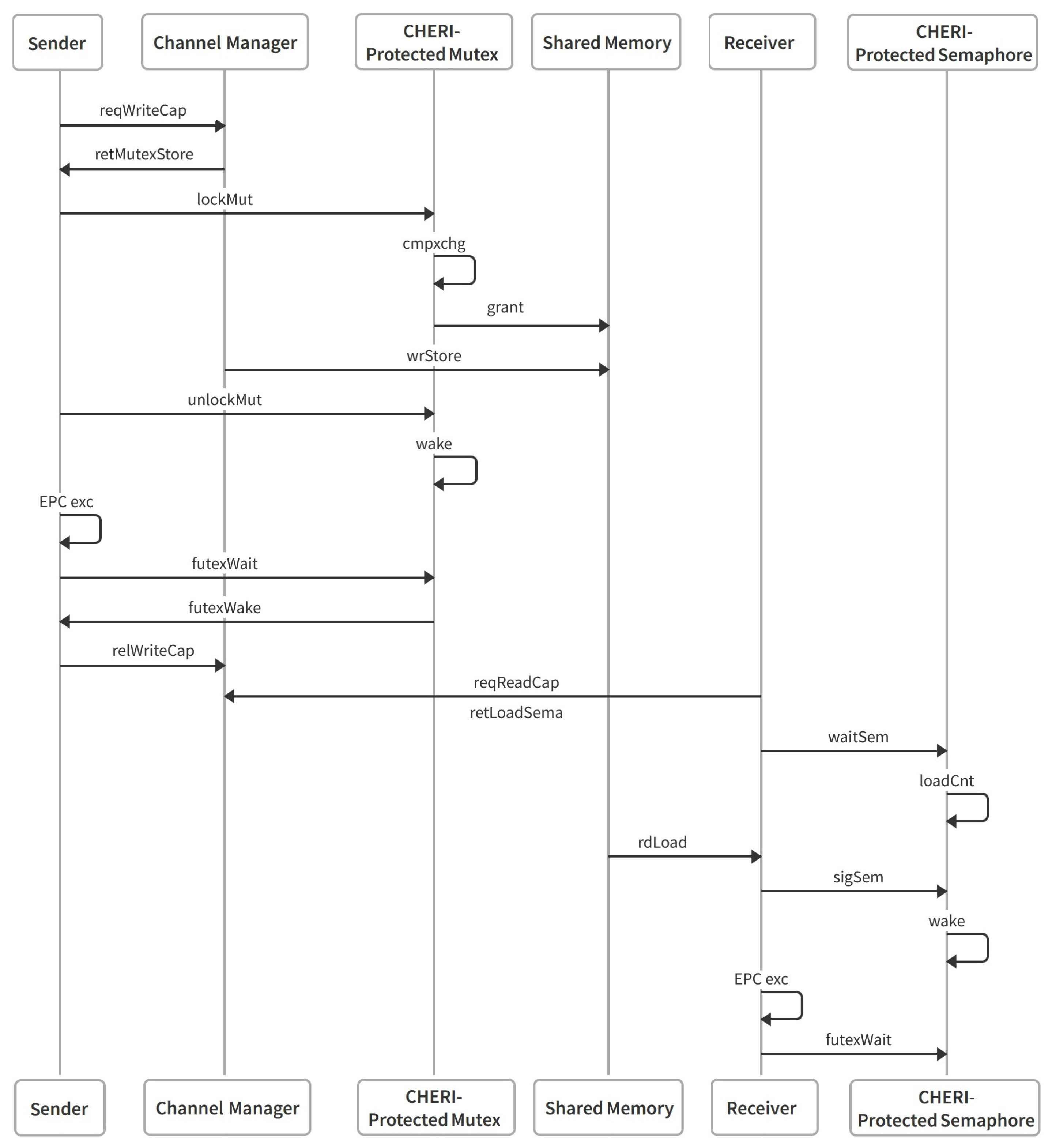 The proposed model leverages CHERI capabilities to enforce strict, compartment-level access control over synchronization primitives. We employ mutexes and semaphores as the core synchronization mechanisms for cross-compartment interactions. Mutexes provide exclusive write access to shared memory, ensuring that only one sender can modify data at a time. Moreover, semaphores enable concurrent read access, allowing multiple receivers to retrieve data safely while avoiding race conditions.