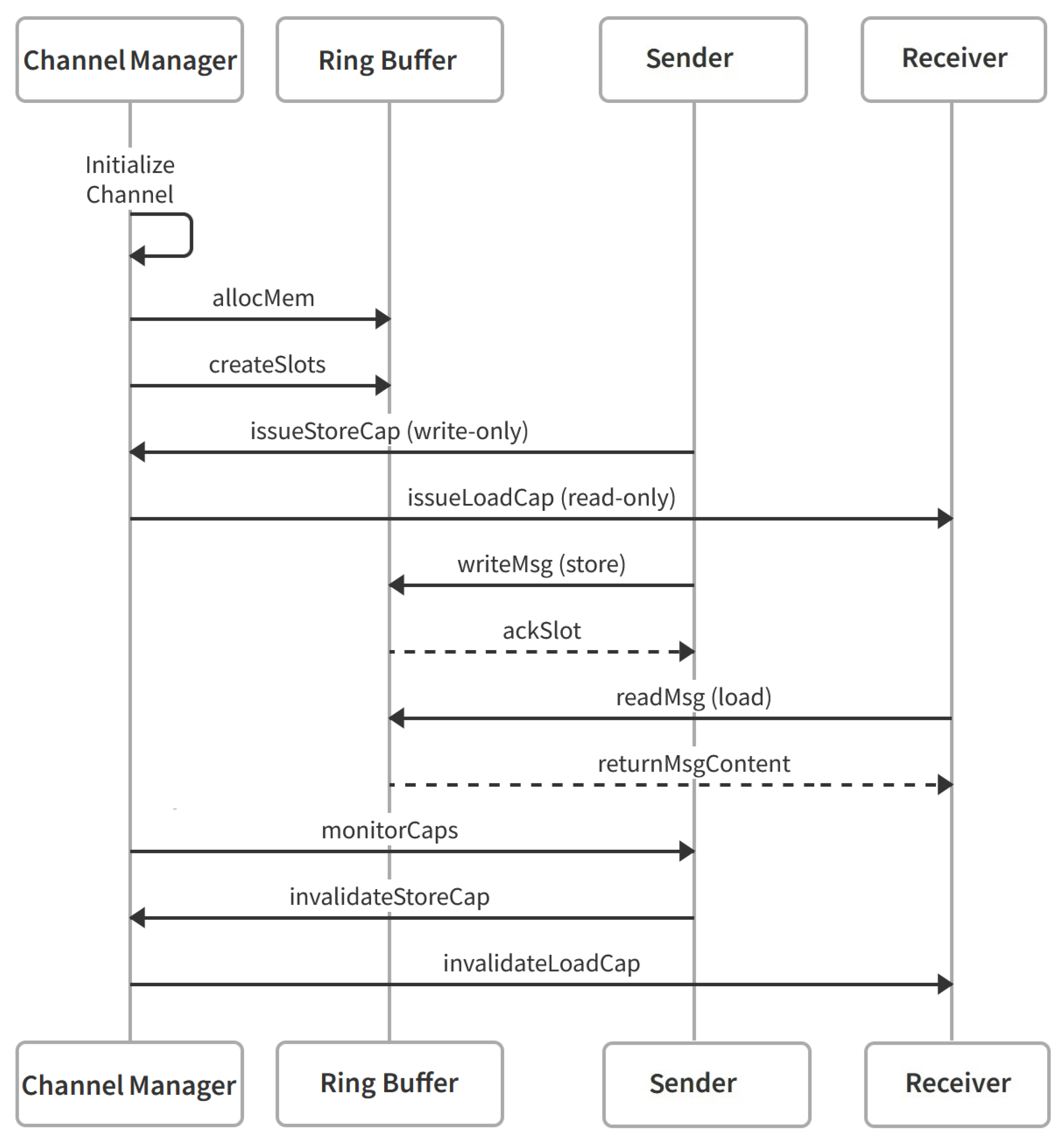 CHERI’s temporal safety further enhances security by automatically invalidating capabilities after a configurable timeout, preventing use-after-free attacks. A trusted channel manager oversees channel creation, allocates ring buffer slots, and issues sealed capabilities to participating compartments. Data transfer occurs entirely within the shared memory region, with CHERI hardware enforcing bounds checks, eliminating extra copies, and minimizing latency. A shared library abstraction provides producer–consumer counter management routines, reducing cross-compartment calls and leveraging CHERI’s lightweight synchronization primitives for optimal throughput, as shown in