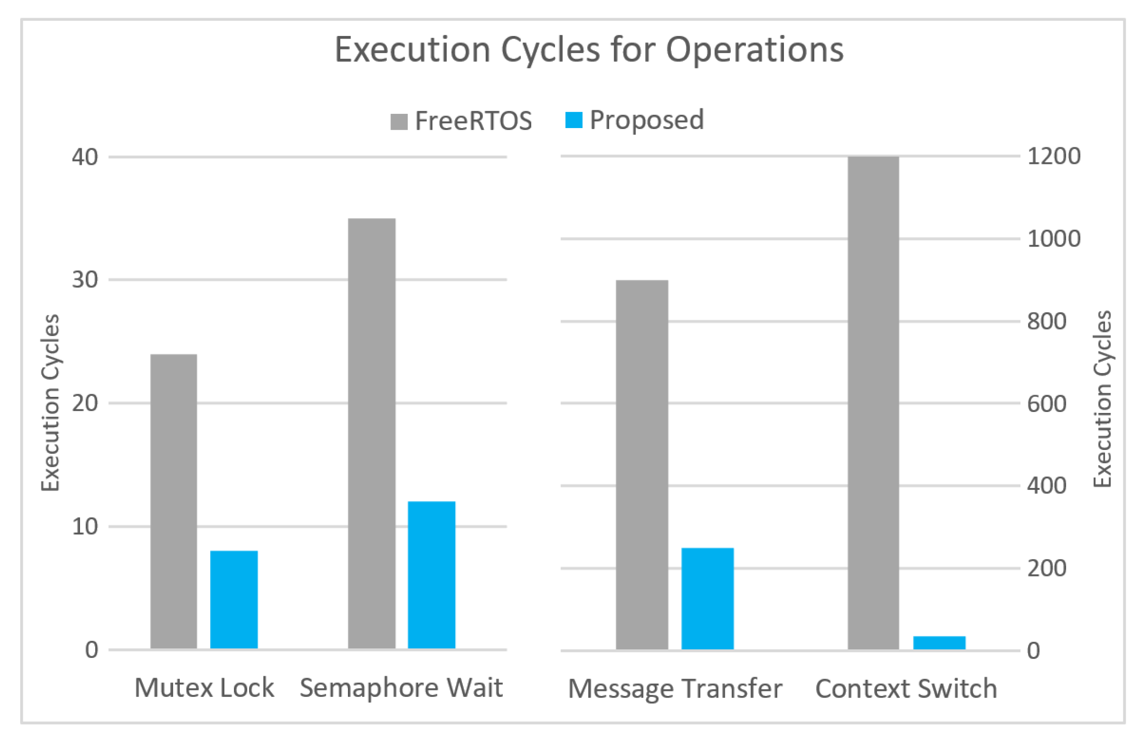 Figure 4 further illustrates these performance trends by plotting execution cycle counts for key operations. The proposed ITC model consistently outperforms baseline FreeRTOS, delivering up to a threefold reduction in mutex lock latency and over 70% improvement in message transfer efficiency. Notably, while message transfer latency scales linearly with message size, the proposed model maintains substantially lower per-byte overhead compared to traditional implementations. This linear scaling, combined with a lightweight synchronization design, ensures sustained high performance even for larger messages.