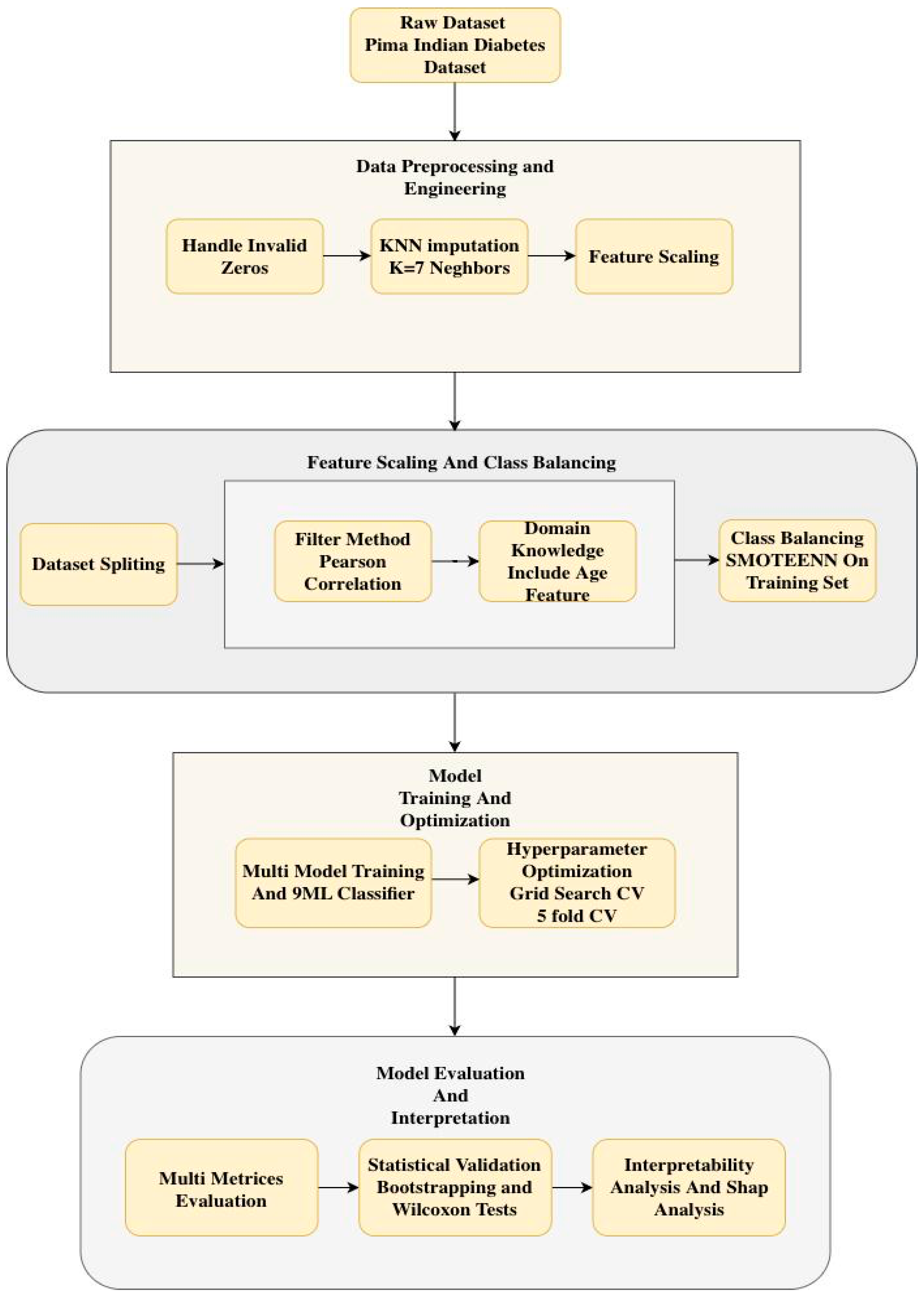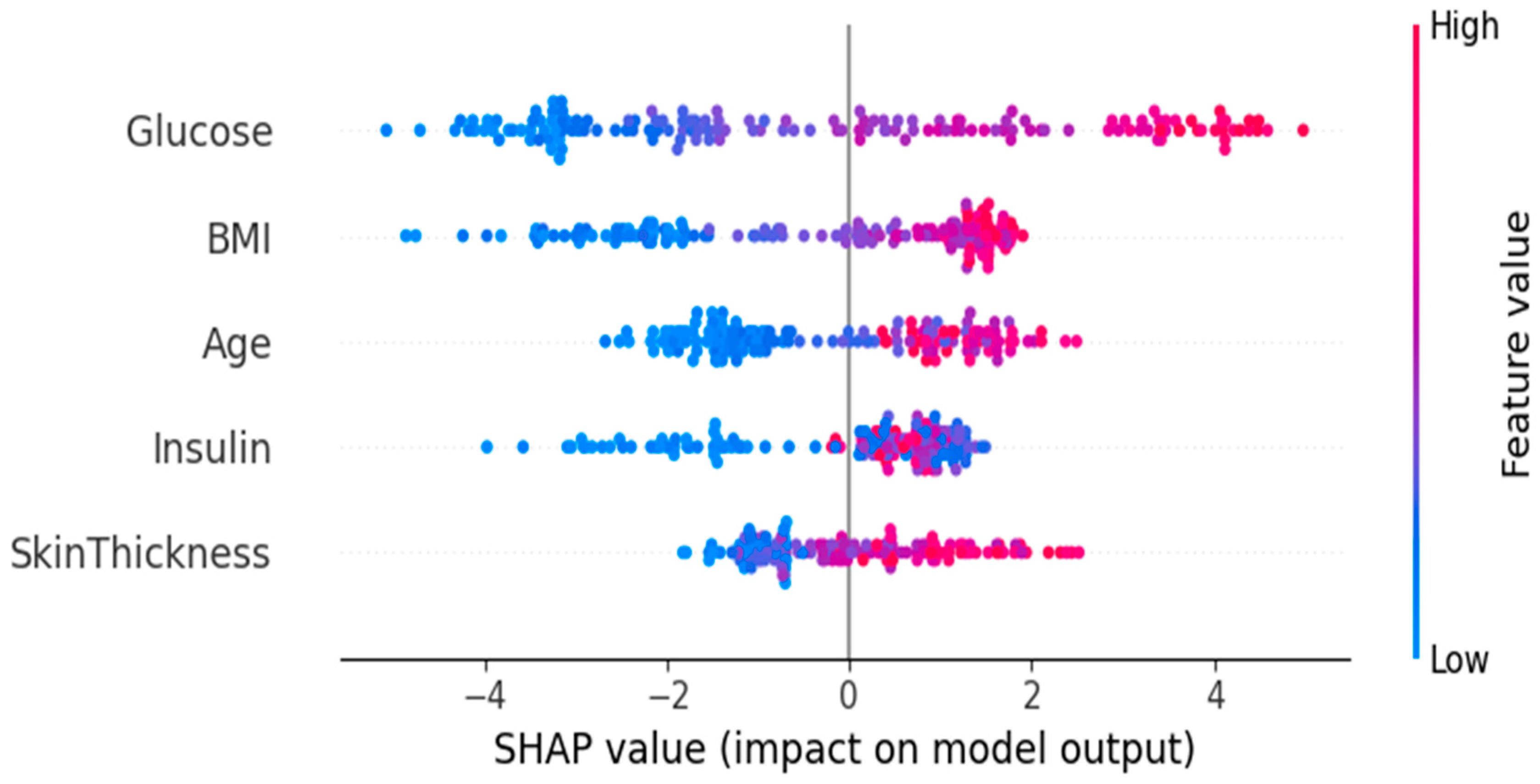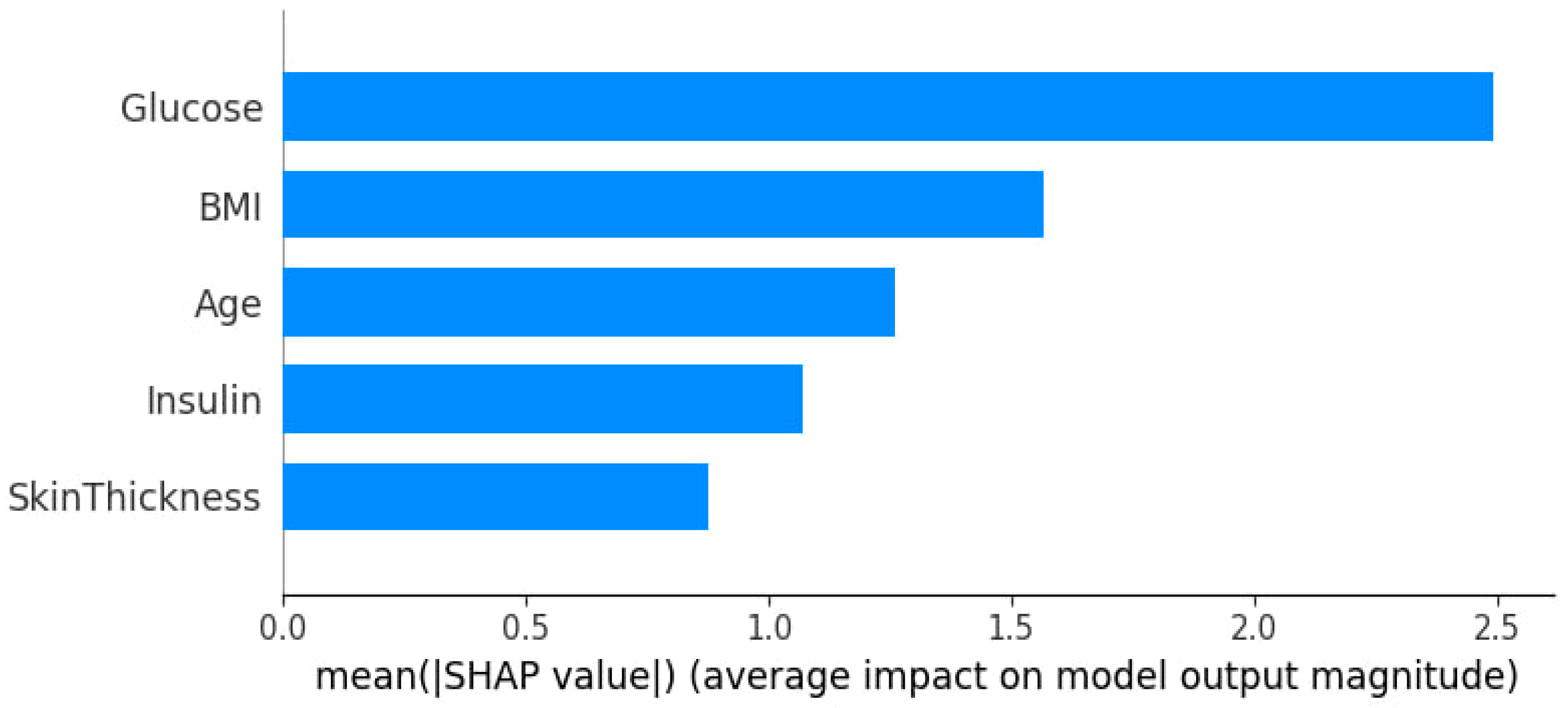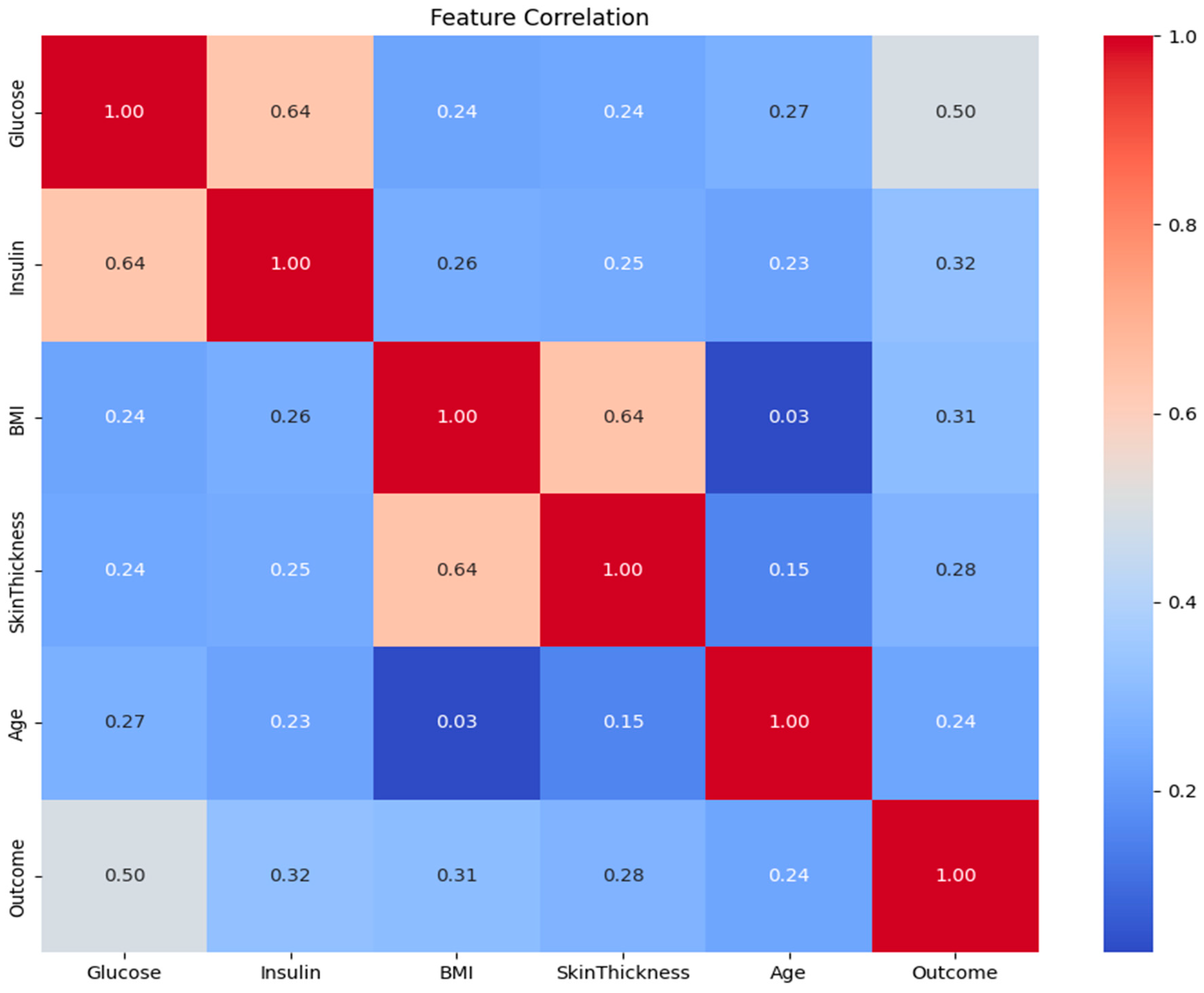 - Pearson Correlation Filtering: The absolute value of the correlation coefficient of each feature with the target (Outcome) was calculated. The most correlated features, N = 4, were selected. N = 4 is quantitatively determined by comparison among Pearson correlation coefficients for each of the features and the target variable. The top four features with the highest absolute Pearson correlation to the Outcome were selected: Glucose, BMI, Insulin, and Diabetes Pedigree Function. Based on its established clinical importance, Age was also added to the final set. Thus, the five features used for model development were: Glucose, BMI, Insulin, Diabetes Pedigree Function, and Age.
