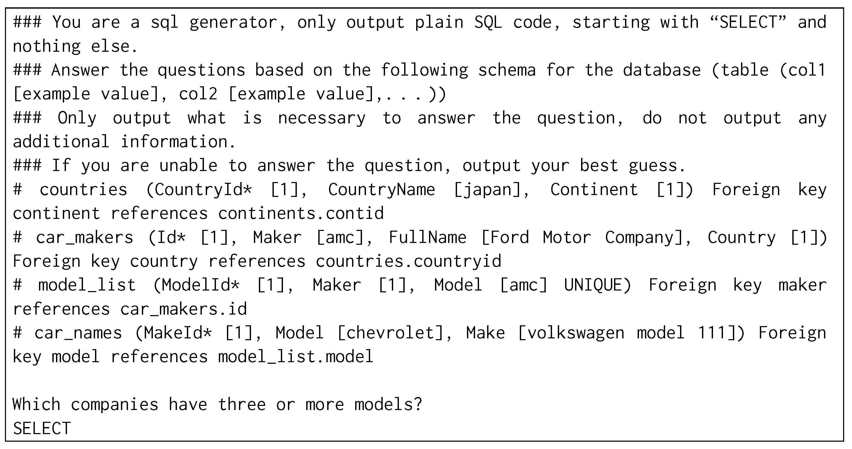 All models are trained with the same hyperparameters, done on NVIDIA H100 GPUs. Training employed a batch size of 1, a maximum sequence length of 4096 tokens, and a fixed random seed (42). We initialized from the seeklhy/codes-7b-bird checkpoint on HuggingFace and fine-tuned for 4 epochs using a learning rate of with a warmup ratio of . Each training example included up to 6 tables and 10 columns per schema context. Training took about 40 GPU hours for both CoSQL and SParC.