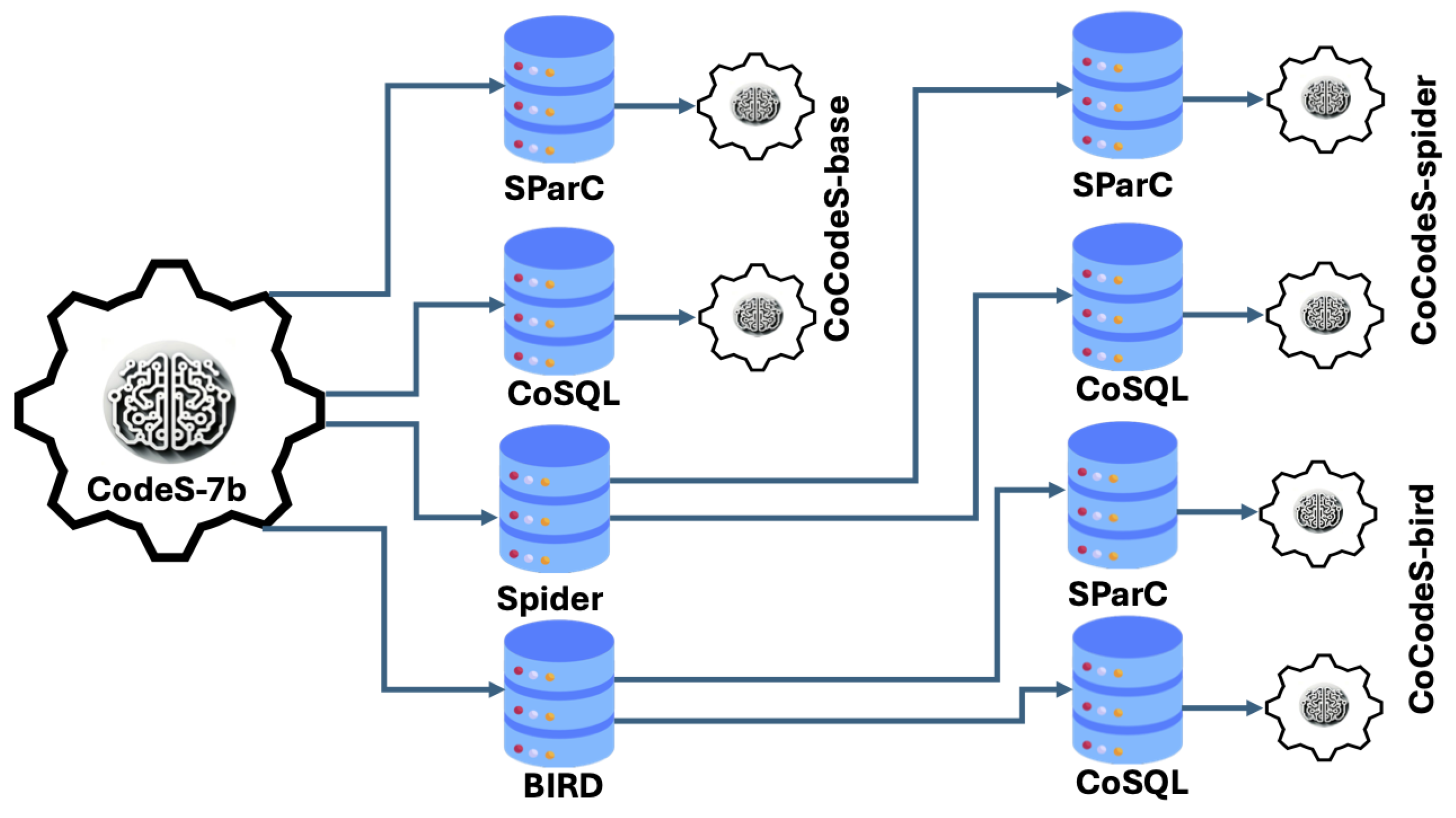 We present CoCodeS, our proposed adaptation of the single-turn text-to-SQL model CodeS-7b to the multi-turn tasks of CoSQL and SParC. The creation process fr CoCodeS is shown in