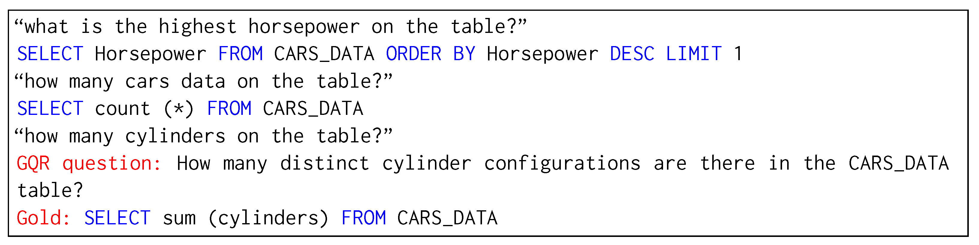 Although question rewriting was intended to simplify input length and clarify context, our experiments show it can degrade performance slightly compared to full-history concatenation across all metrics. Specifically, on CoSQL, GQR scored about 4% lower than full-history, while on SParC this discrepancy increases to about 8%. Closer inspection reveals that the GPT-generated rewrites had two main issues. First, it may restructure certain queries, omitting minor details. Furthermore, while analyzing SParC and CoSQL dialogues, we found that annotations sometimes exhibit inconsistencies, and many questions have significant ambiguity, making it unclear if the gold SQL is truly unique or whether multiple distinct queries could be valid responses. Ambiguous questions can generate multiple plausible rewrites from GQR, especially regarding which columns to include, and the selected rewrite might cause model output to differ from the reference SQL.