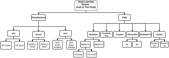Figure 3. A set of main CNN and Transformer deep learning image classifier models. - Optimization Strategies: Investigate knowledge distillation and self-attention mechanisms to enhance lightweight Convolutional Neural Networks (CNNs), assessing their effect on performance and robustness under deployment constraints.