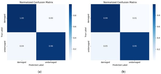 To mitigate this imbalance, we combined the multi-class Roboflow dataset with the binary Nordtank dataset, effectively enriching the minority (damaged) samples. Example images of damaged and undamaged blades are provided in Figure 5, where panel (a) corresponds to damaged blades (a) and panel (b) corresponds to undamaged blades (b). In addition, extensive data augmentation techniques including random rotation, flipping, color jitter, and Gaussian noise were applied during training to increase intra-class variability and prevent overfitting to the majority class. This combined strategy helped reduce the impact of class imbalance without requiring explicit re-weighting or synthetic oversampling. Future work may nonetheless investigate complementary approaches such as focal loss or adaptive class weighting to further improve robustness.